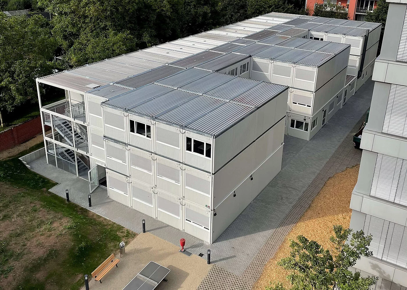 Diese zweigeschossige Wohnanlage wird derzeit als Übergangslösung genutzt und bietet mit 41 Containern auf 719 Quadratmetern viel Platz. Das Obergeschoss der Anlage wird über zwei außenliegende Stahltreppen erschlossen. Die Containeranlage besitzt zwei separate Dachterrassen, welche zum Verweilen einladen. Zudem wirken die Flure durch die bodentiefen Fenster geräumiger und werden besonders lichtdurchflutet.