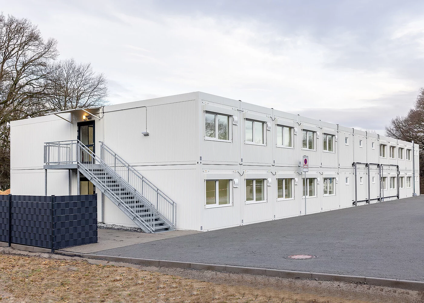 Diese zweigeschossige Containeranlage wird derzeit als Übergangslösung genutzt und bietet mit 66 Containern auf 1.147 Quadratmetern viel Platz. Das Obergeschoss der Anlage wird über ein innenliegendes Treppenhaus und einer außenliegenden Stahltreppe erschlossen. Die mobilen Räume können für Ihren Bedarf flexibel umgenutzt und versetzt werden, beispielsweise als ergänzende Raumlösung für Ihre Flüchtlingsunterkunft oder Monteurunterkunft.