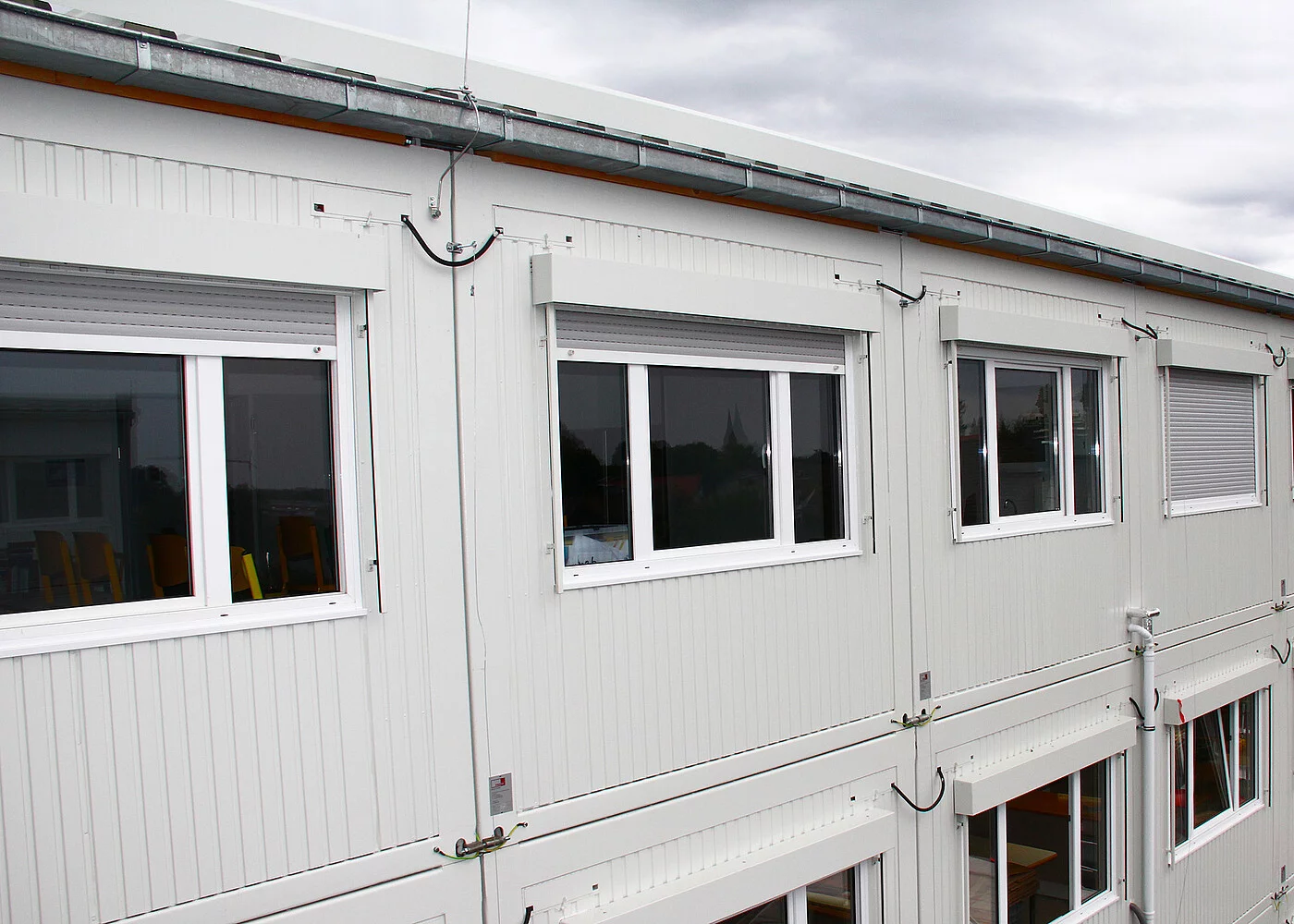 Der Klassencontainer besteht aus einer 2-geschossigen Containeranlage. Das Obergeschoss der Anlage wird über ein innenliegendes Treppenhaus und eine außenliegende Stahltreppe erschlossen. Der Klassencontainer beinhaltet Klassenräume mit Waschbecken, Sanitäranlagen, Abstellräume, ein Lehrerzimmer mit Küchenzeile, ein Putzmittelraum und einen Hausanschluss-Raum.