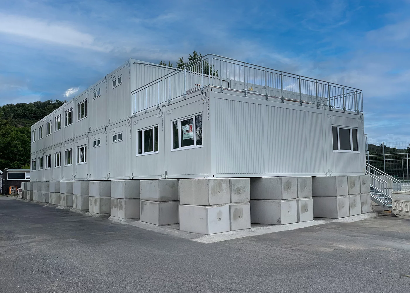 Diese zweigeschossige Büroanlage wird derzeit als Übergangslösung genutzt und bietet mit 86 Containern auf 1.398 Quadratmetern viel Platz. Das Obergeschoss der Anlage wird über ein innenliegendes Treppenhaus und zwei außenliegenden Stahltreppen erschlossen. Die mobilen Räume können für Ihren Bedarf flexibel umgenutzt und versetzt werden, beispielsweise als ergänzende Raumlösung für Ihr Büro- und Verwaltungsgebäude.