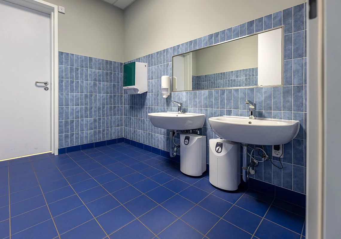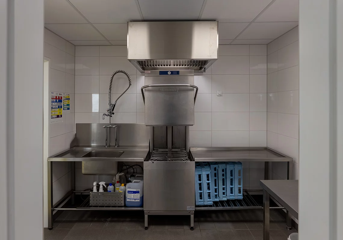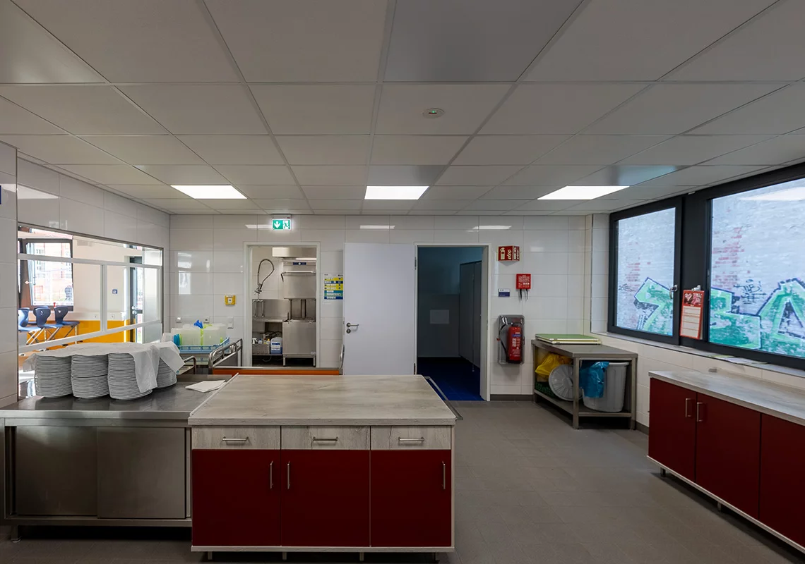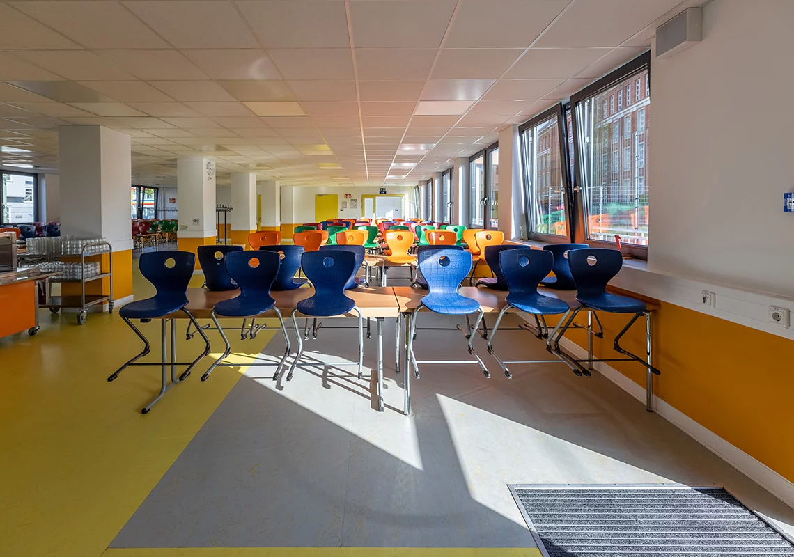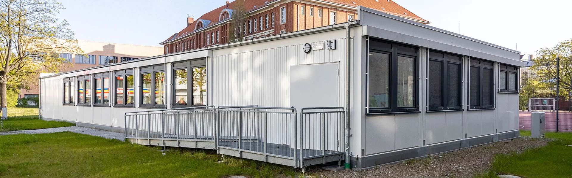 Im Rahmen von Sanierungs- und Erweiterungsmaßnahmen wurde auf dem Schulgrundstück eine Interimslösung errichtet, zu der eine eingeschossige Mensa gehört. Die 20 Container der Baureihe ProENERGY bringen einen geräumigen Speisesaal, eine gutausgestattete Küche mit Ausgabebereich, eine Spülküche sowie Lagermöglichkeiten und Sanitäranlagen unter. Durch eine funktionale Aufteilung und optimale Nutzung können hier knapp 170 Kinder ihre Pause verbringen, zudem ist das Gebäude barrierefrei über eine Rampe gut zugänglich.
