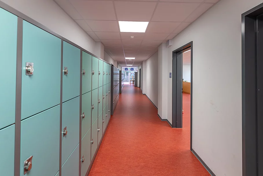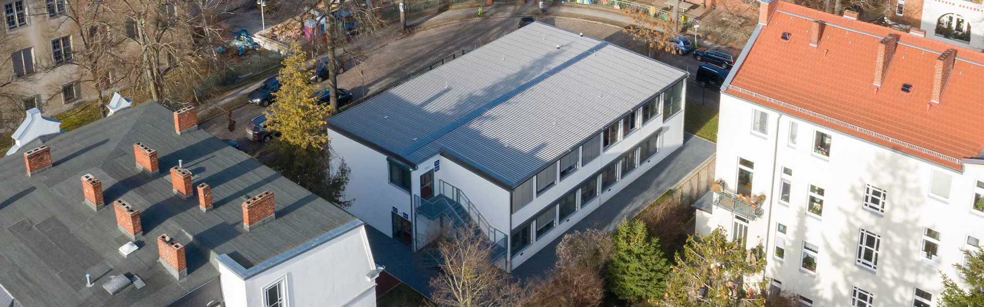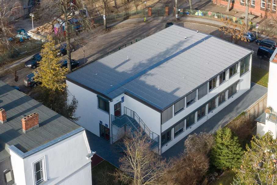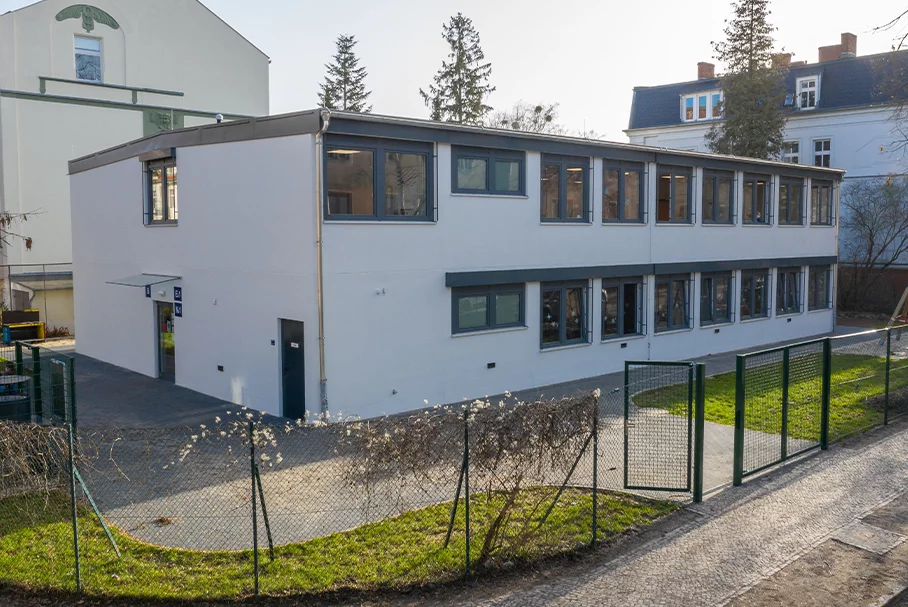 Die Berliner Schulbauoffensive ist derzeit eines der größten Investitionsvorhaben für die Schulen in Deutschland. Sie soll den notwendigen Kapazitätsausbau durch Neubau- und Erweiterungsmaßnahmen zeitgerecht gewährleisten. Dazu leistet FAGSI mit hochwertigen Containergebäuden einen Beitrag – beispielsweise mit dem Erweiterungsbau an der Käthe-Kruse-Grundschule in Berlin Steglitz-Zehlendorf. Die Bauaufgabe dort lautete: Erstellt eine schlüsselfertige Komplettlösung, die alle gesetzlichen Anforderungen an ein dauerhaftes Gebäude erfüllt – aber das in nur vier Monaten Bauzeit vor Ort von unterkante Fundament bis Oberkante Blitzschutz und inklusive Außenanlagen. Einer solchen Bauaufgabe sind nicht viele Anbieter gewachsen. „Dass wir dazu in der Lage sind, hatten wir bei bereits bei mehreren Projekten, die wir für den Kunden abgewickelt haben, unter Beweis gestellt“, erläutert Eric Rafka, im FAGSI Vertriebsbüro zuständig für das Projekt. Entstanden ist ein attraktives zweigeschossiges Schulgebäude mit einer Bruttogrundfläche von 622 qm, das innerhalb weniger Tage aus 42 Containern der Baureihe ProENERGY zusammengefügt wurde. Die FAGSI Baureihe ProENERGY zeichnet sich dadurch aus, dass Sie für Standzeiten über zwei Jahren konzipiert wurde. Hervorragende energetische Eigenschaften und die Verwendung hochwertiger, wohngesunder Materialien sorgen für ein angenehmes Lern- und Arbeitsklima und erfüllen so auch höchste Ansprüche. Das Gebäude kann von beiden Kopfseiten aus betreten werden. Auf beiden Ebenen sind jeweils vier Klassenräume entlang der Mittelflure angeordnet. Im Erdgeschoss befinden sich der Sanitärbereich für die Mädchen, eine Behinderten-WC und der Hausanschlussraum. Im Obergeschoss komplettiert der WC-Bereich für die Jungen und ein Aufenthaltsraum mit Küche für die Erzieher das Raumprogramm des Erweiterungsbaus. Um dem Gebäude eine hochwertige, dauerhafte Optik zu verleihen, wurde den Containern eine Fassade aus weißem Putz vorgehängt. „Auch dieses Projekt mit der Bauabteilung des Bezirksamtes Steglitz-Zehlendorf - und dort insbesondere mit der Projektleiterin Frau Sabine Mahlich – abwickeln zu dürfen, ist aufgrund der zielorientierten und pragmatischen Zusammenarbeit eine echte Freude gewesen“, so das Fazit von Eric Rafka.