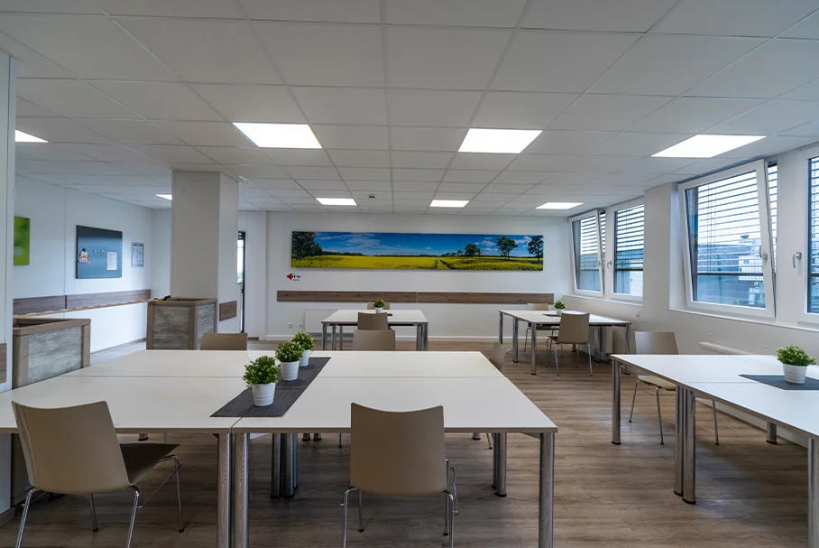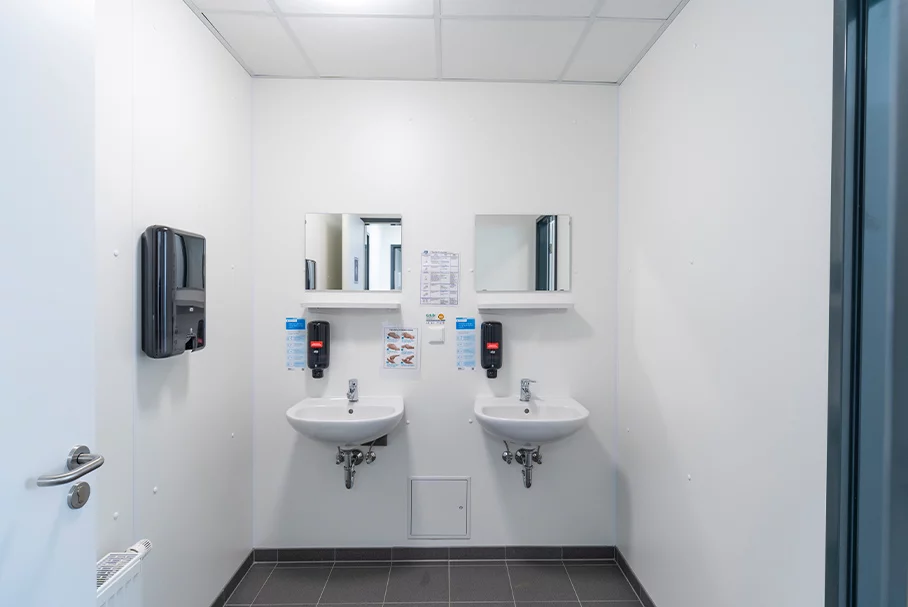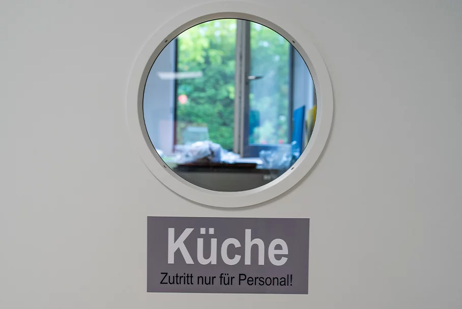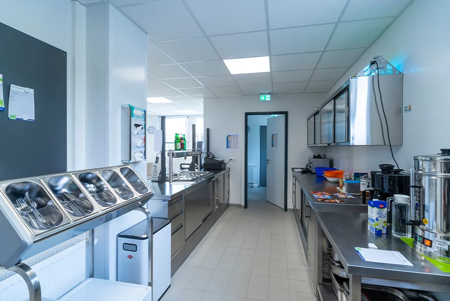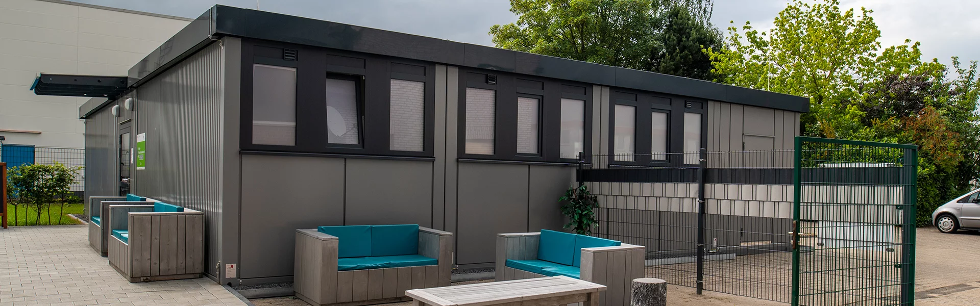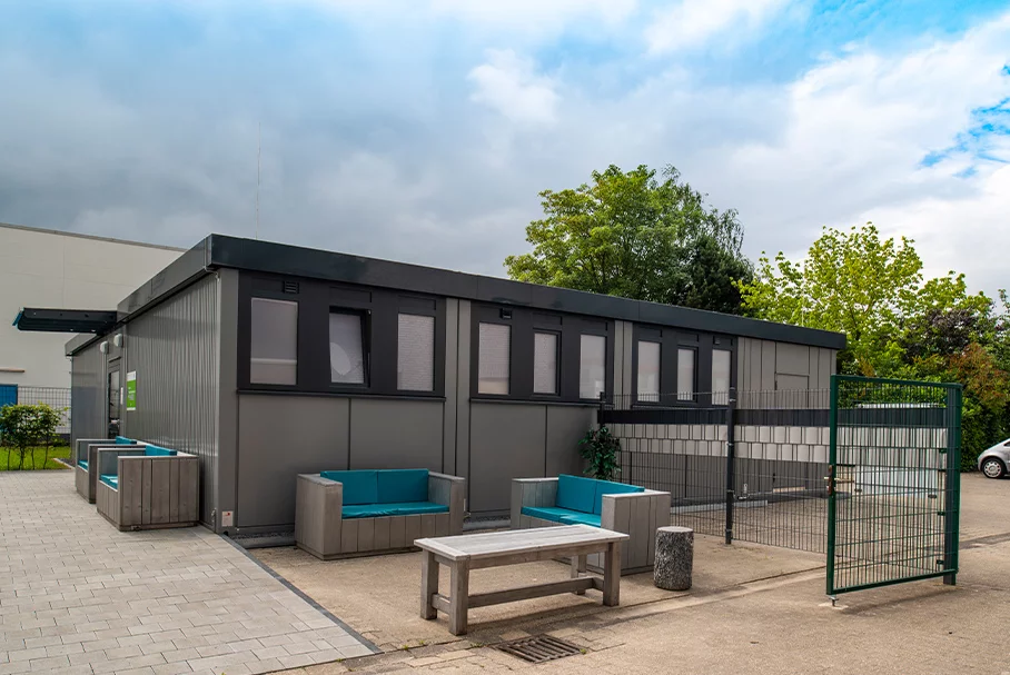 Die Katharina Kasper ViaNobis GmbH ist ein Unternehmen der DERNBACHER GRUPPE KATHARINA KASPER und als renommierter Träger in der Gesundheits-, Pflege- und Sozialbranche tätig. Am Standort Geilenkirchen-Niederheid betreibt das Unternehmen ein Bildungszentrum, das es Menschen im Rahmen der beruflichen Rehabilitation ermöglicht, wieder am beruflichen und sozialen Leben teilhaben zu können. 2019 beauftragte ViaNobis FAGSI mit dem Bau einer Kantine am Bildungszentrum. Das eingeschossige Gebäude besteht aus 10 Containern der Produktlinie FAGSI ProENERGY. Obwohl die Kantine mit 177 qm eher klein ist, ist sie mit sehr viel Technik – u.a. LED-Beleuchtung, Warmwasser-Heizung, Industrieküche – ausgestattet und noch dazu sehr hochwertig, denn der Kunde hatte hohe Anforderungen und Erwartungen an das Projekt. Über den Eingang an der Stirnseite des Gebäudes gelangt man in den gut 70 qm großen Speisesaal. Der hochwertige und strapazierfähige PVC-Boden in Holzoptik verleiht dem Raum eine freundliche und wohnliche Ausstrahlung. Die Fensterfront versorgt den Aufenthaltsbereich mit viel Tageslicht. Rechts der Eingangstür befinden sich die Sanitärbereiche - jeweils für Damen, Herren und behindertengerechtes WC, in die man über einen kleinen Vorraum gelangt. Über die gesamte dem Eingang gegenüberliegende Stirnseite erstreckt sich der Küchenbereich, den man durch eine Tür mit einen Bulls Eye betritt. Eine Edelstahl-Theke, die als Essensausgabe dient, grenzt den Speisesaal von der Küche ab. Von dort gelangt man auf der einen Seite in die angrenzende Spülküche. An der anderen Seite schließen sich die Küche und ein Lagerraum an, der zugleich auch Hausanschlussraum dient. Von außen präsentiert sich die Kantine dezent und dadurch edel. Dadurch, dass Containerrahmen und Glattblechfassade im selben hellgrauen Farbton lackiert wurden, erscheint das Gebäude wie aus einem Guss. Der umlaufende Dachrahmen, die Fenster und der außenliegende Sonnenschutz sind in Anthrazit gehalten und setzen reizvolle Akzente.