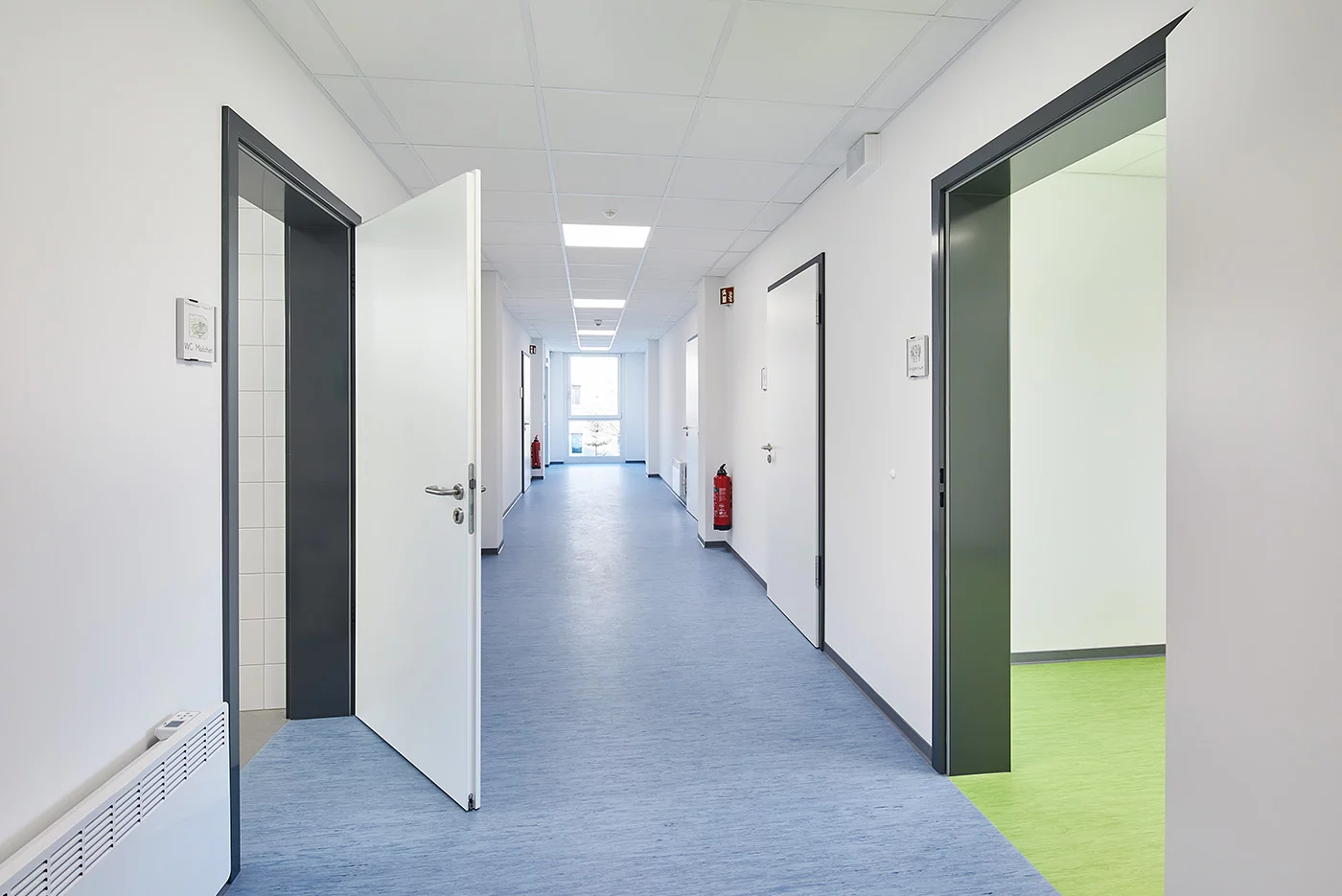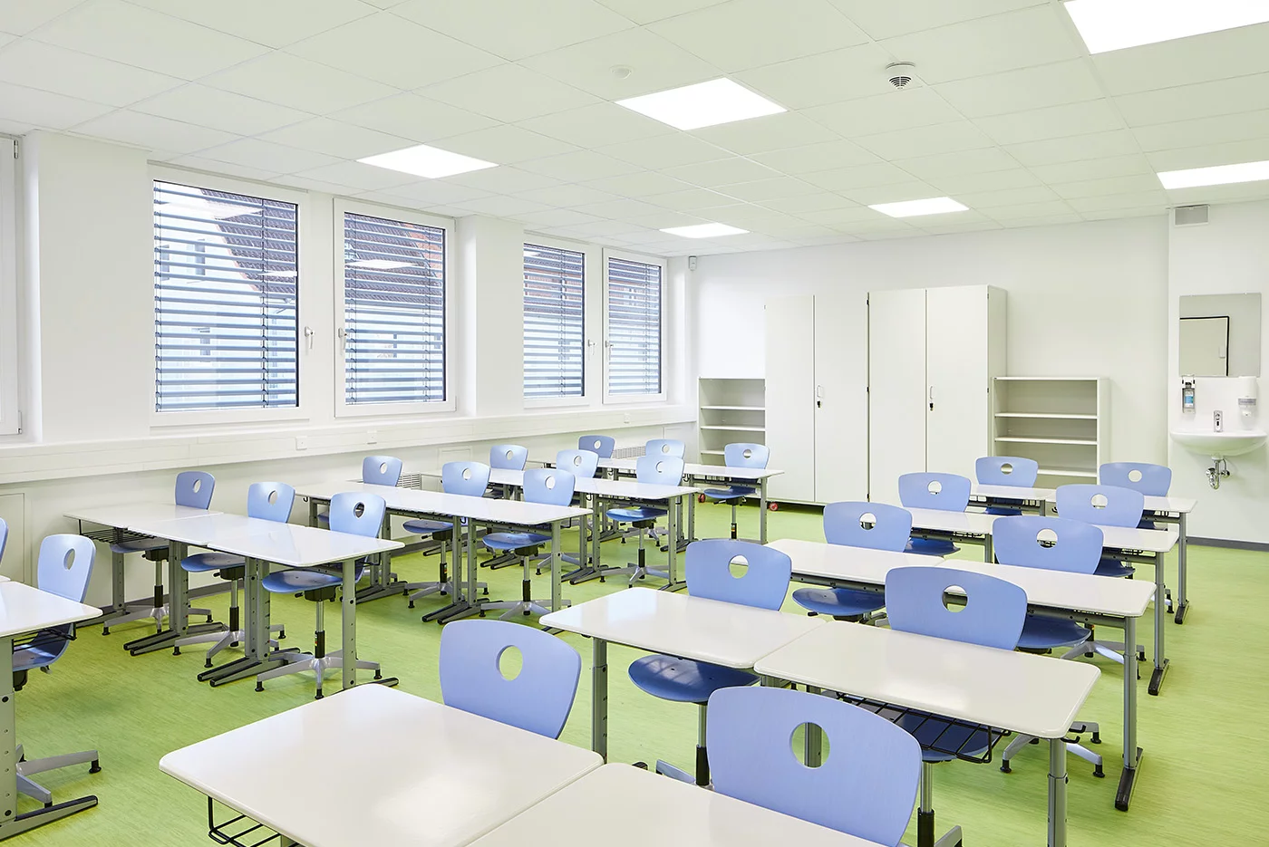 Der Kunde legte bei der Planung und Umsetzung großen Wert auf eine qualitativ hochwertige und optisch ansprechende Umsetzung. Das standardisierte Raster ermöglichte eine effiziente und schnelle Planung der Anlage, tat aber der Individualität keinen Abbruch. Der Kunde wählte zum Beispiel eine farbenfrohe Gestaltung im Innen- sowie Außenbereich: die Fassade erstrahlt in fröhlichem Türkis, die Farbgebung des Fußbodens im Innenbereich kennzeichnet zudem verschiedene Raumnutzungen. Während die Flure einen hellblauen Belag erhielten, erstrahlen die Klassenräume in Apfelgrün. Für die Aufenthaltsbereiche der Lehrkräfte wurde ein sanftes Beige gewählt und für die Sanitärbereiche ein unempfindliches Hellgrau. Die Automatisierung durch smarte Gebäudetechnik ist auch bei der Realisierung von temporären Gebäudelösungen zunehmend ein Thema und problemlos möglich. Die gesamte Beleuchtung im Erweiterungsbau der Weingartenschule wird mit Bewegungsmeldern geregelt und spart nicht nur Energie, sondern ist auch unter Hygienegesichtspunkten besonders sinnvoll. Auch was die mediale Schulausstattung betrifft, wird in Lauenburg in die Zukunft investiert. Whiteboards statt klassischer Tafeln sind in der Weingartenschule Standard. „Wir können ohne zusätzliches Gerät Unterlagen direkt vom iPad auf das Board übertragen“, schwärmt Schulleiterin Scholz. „Ist doch klar, dass wir für das neue Schulgebäude in modernste Technik investieren. Die Ausstattung ist ja später auch im umgebauten Hauptgebäude nutzbar“, ergänzt Bauamtsleiter Reinhard Nieberg.