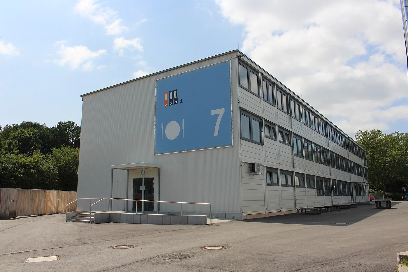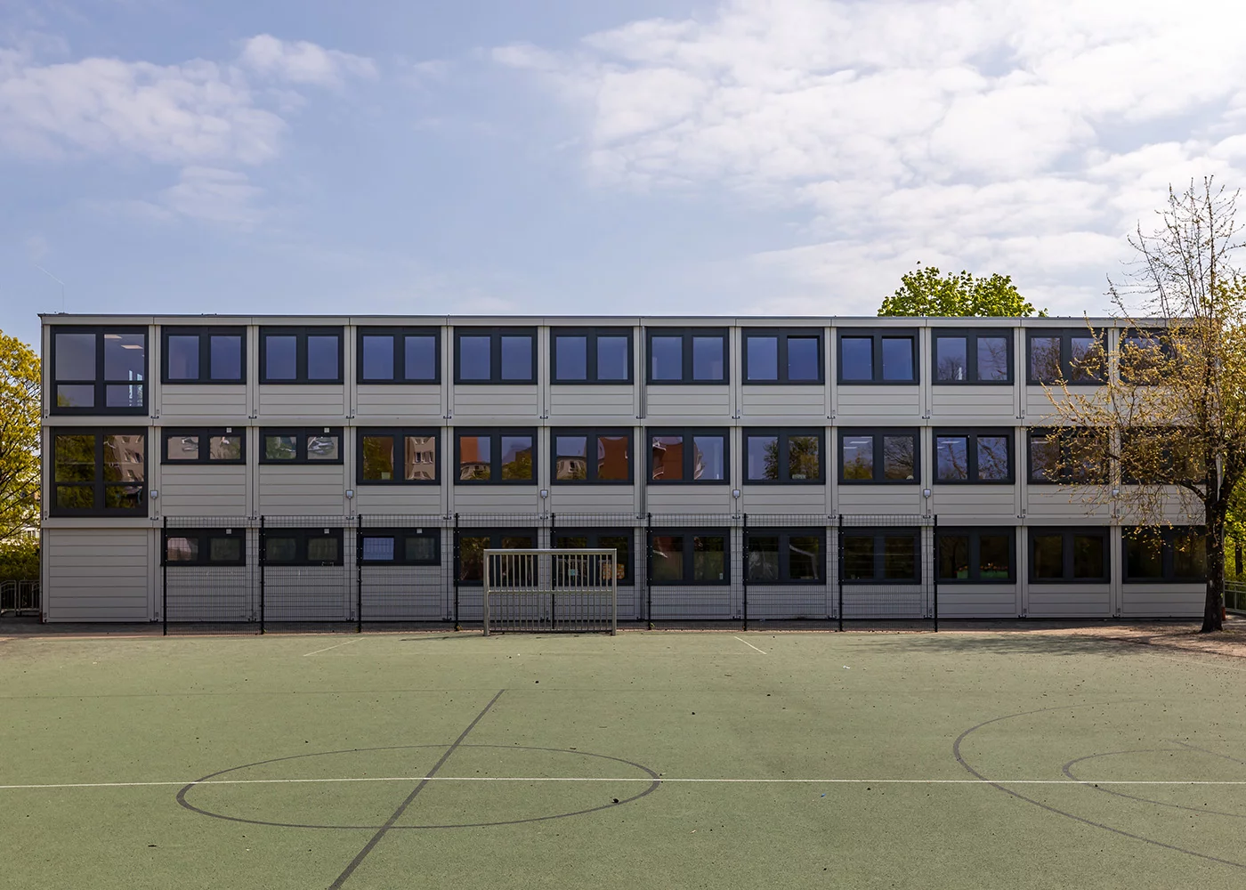 Diese dreigeschossige Containeranlage wird derzeit als Übergangslösung genutzt und bietet mit 285 Containern auf 5.041 Quadratmetern, einer großen Aula, zwei großen Schulküchen und zahlreichen Nebenräumen viel Platz. Die mobilen Räume können für Ihren Bedarf flexibel umgenutzt und versetzt werden.