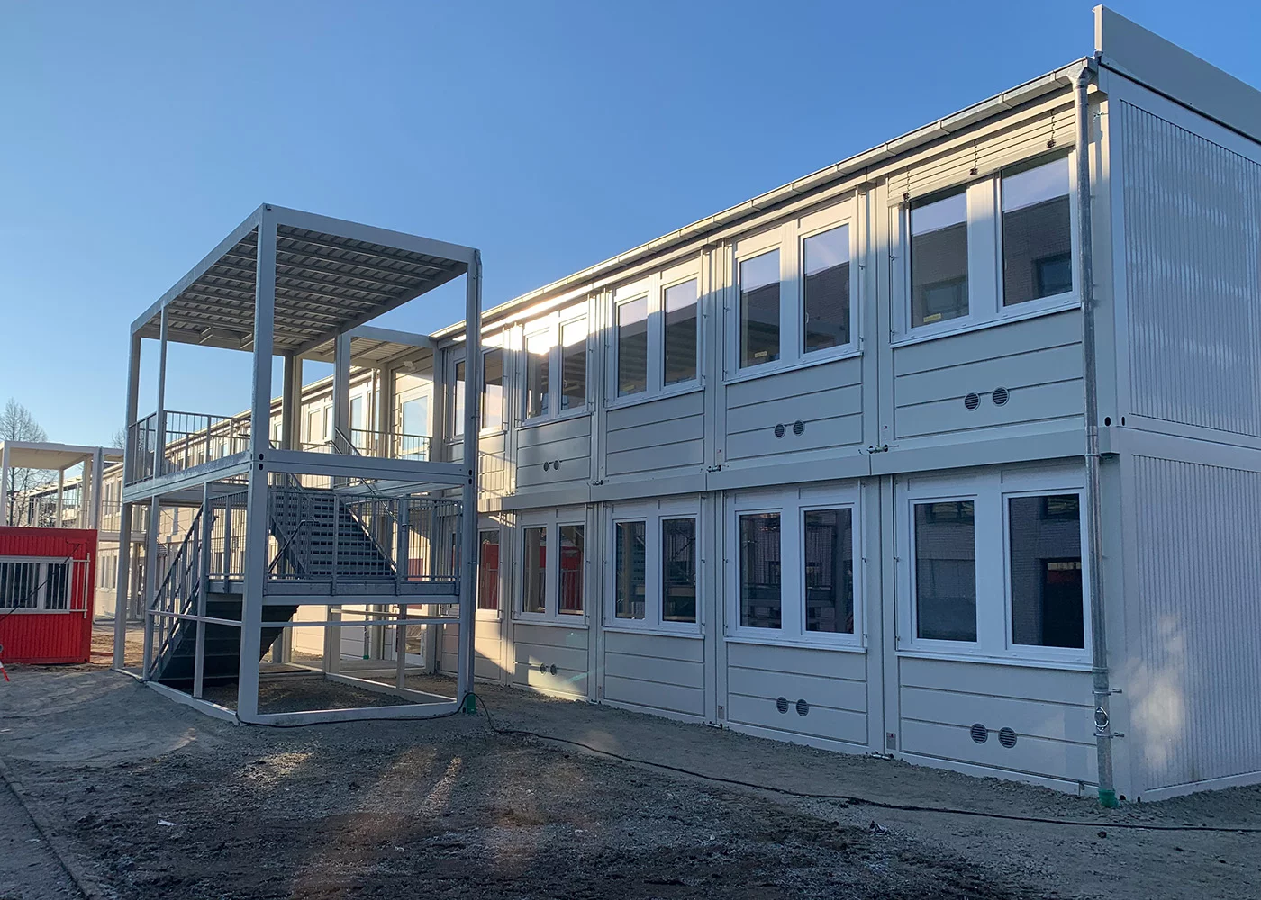 Diese zweigeschossige Wohnanlage wird derzeit als Übergangslösung genutzt und bietet mit 41 Containern auf 719 Quadratmetern viel Platz. Das Obergeschoss der Anlage wird über zwei außenliegende Stahltreppen erschlossen. Die Containeranlage besitzt zwei separate Dachterrassen, welche zum Verweilen einladen. Zudem wirken die Flure durch die bodentiefen Fenster geräumiger und werden besonders lichtdurchflutet.