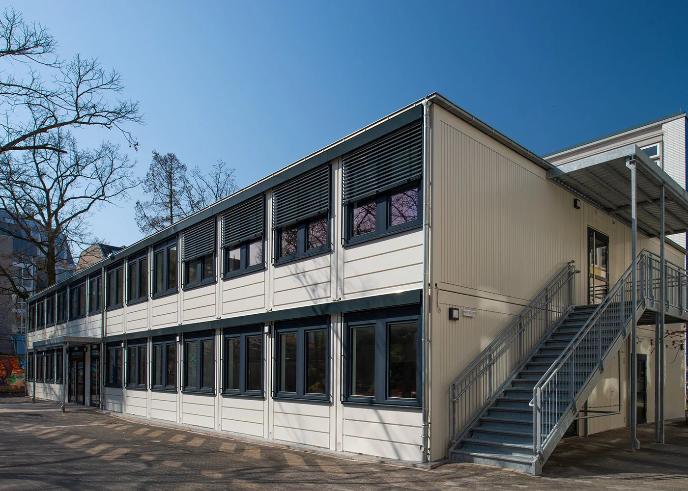 Der Klassencontainer besteht aus einer 2-geschossigen Containeranlage. Das Obergeschoss der Anlage wird über ein innenliegendes Treppenhaus und eine außenliegende Stahltreppe erschlossen. Der Klassencontainer beinhaltet Klassenräume mit Waschbecken, Sanitäranlagen, Abstellräume, ein Lehrerzimmer mit Küchenzeile, ein Putzmittelraum und einen Hausanschluss-Raum.