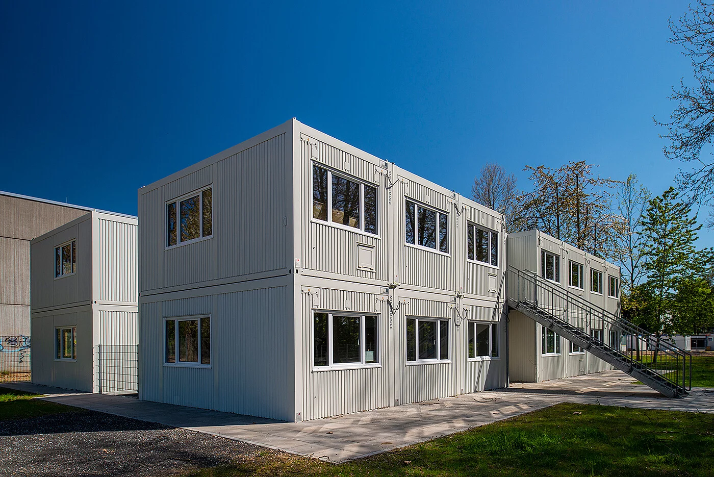 In den ehemaligen Bürokomplex der Börse AG, den sogenannten Lateral Towers, die von der Stadt Frankfurt angemietet wurden, sollen zwei komplette Gymnasien einziehen. Solange der Bestand umgebaut wird, dient die dreigeschossige Containeranlage mit 165 Container und rund 2.500 Quadratmetern als Übergangslösung. Die mobilen Räume können für Ihren Bedarf flexibel umgenutzt und versetzt werden.
