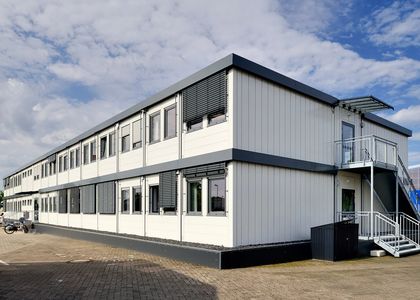 Diese zweigeschossige Büroanlage wird derzeit als Übergangslösung genutzt und bietet mit 86 Containern auf 1.398 Quadratmetern viel Platz. Das Obergeschoss der Anlage wird über ein innenliegendes Treppenhaus und zwei außenliegenden Stahltreppen erschlossen. Die mobilen Räume können für Ihren Bedarf flexibel umgenutzt und versetzt werden, beispielsweise als ergänzende Raumlösung für Ihr Büro- und Verwaltungsgebäude.