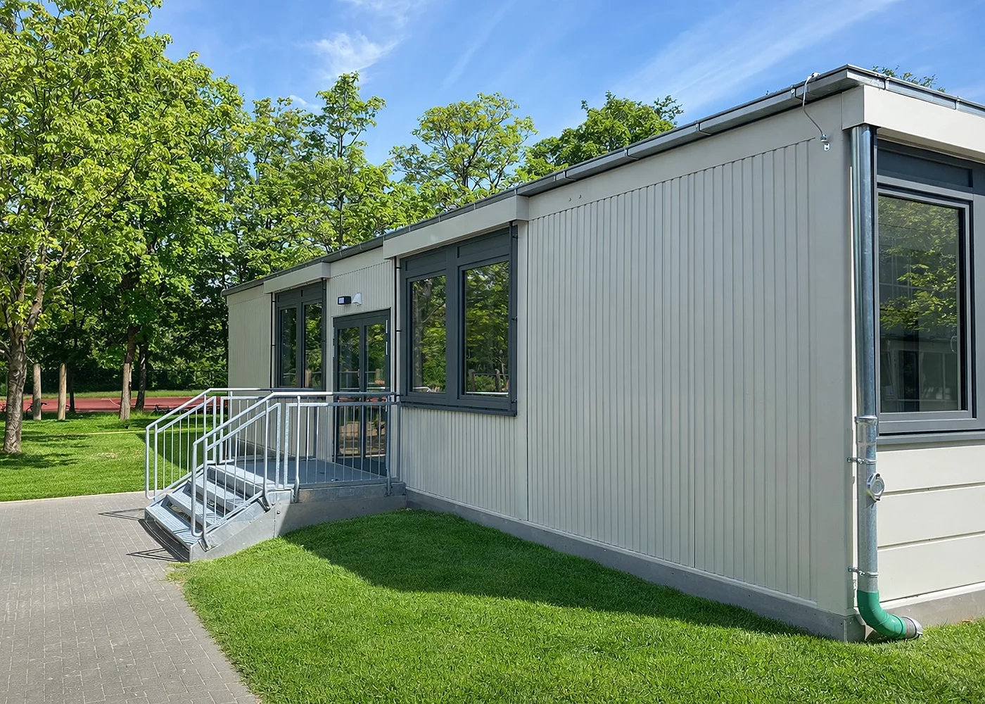 Die eingeschossige Containeranlage wurde als Kita genutzt. Sie besteht aus Gruppen- und Nebenräumen, einem Personalraum, Sanitäranlagen, Abstellräumen, einem Wickelraum, einem Putzmittelraum