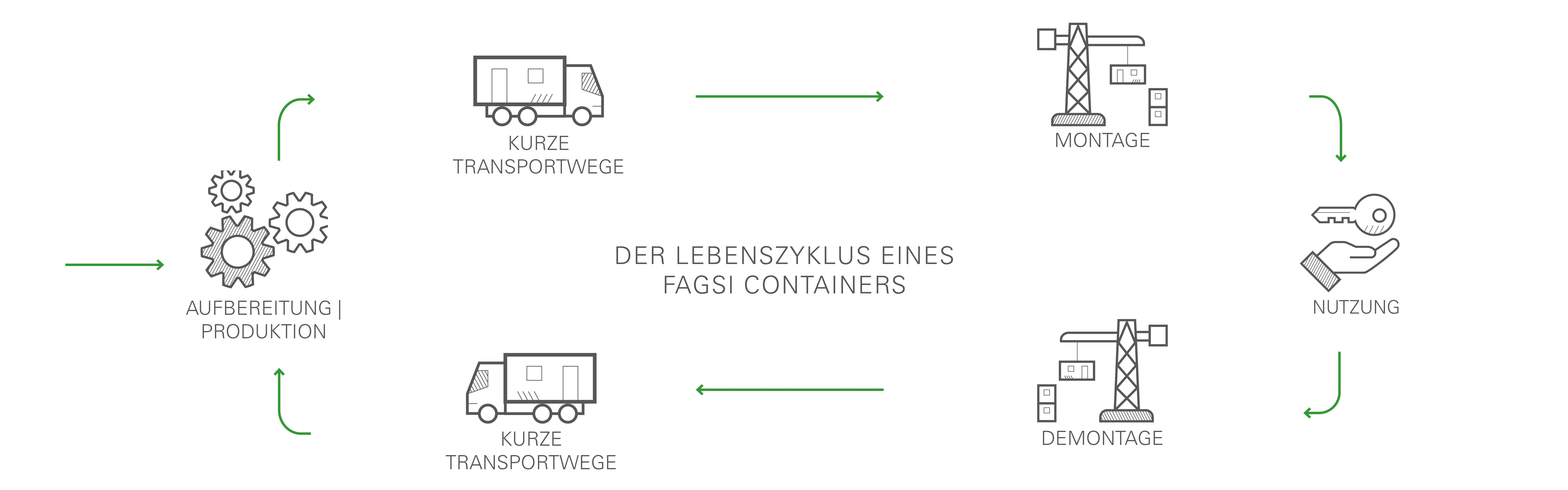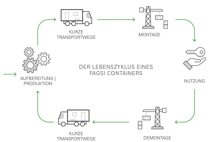 FAGSI ist mit ihren Gebäudelösungen – wenn man so will – eine Pionierin der „Sharing Economy“. Mit den Mietlösungen für Containergebäude betreibt das Unternehmen dieses Geschäftsmodell bereits seit fast 40 Jahren. Kunden nutzen die Gebäude exakt so lange, wie sie diese tatsächlich auch benötigen. Das können nur wenige Monate sein, wie es häufig während Neubau oder Sanierung beispielsweise von Büro- oder Schulgebäuden der Fall ist. Aber auch Standzeiten von mehreren Jahren sind dank der speziell für diese Anforderung entwickelten Produktreihe ProEnergy durchaus üblich. Werden die Containergebäude nicht mehr benötigt, nimmt FAGSI sie wieder zurück und stellt sie aufbereitet und rundumerneuert einem anderen Kunden zur Nutzung auf Zeit zur Verfügung.