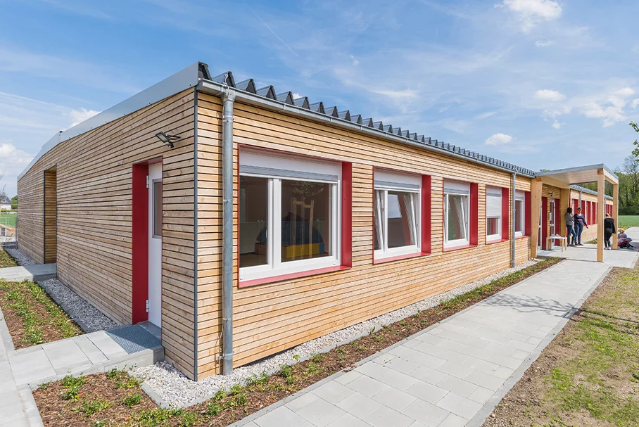 Ein altes Containergebäude abtragen und an anderer Stelle mit neuem Grundriss als Neubau wieder aufrichten: Dass dies möglich ist – sogar in nur wenigen Wochen – beweist das Bauprojekt Kinderhaus Karlsfeld. „Der dringende Bedarf an Betreuungsplätzen ließ uns schnell handeln“, so die Bau-Verantwortlichen. Jahrelang auf ein Massivgebäude zu warten, kam nicht in Frage und selbst die Alternative eines schnell errichteten Modulgebäudes hätte zu lange gedauert. Also entschloss sich die Gemeinde zu einem nicht alltäglichen Schritt: Sie ließ eine bestehende, inzwischen aber ungenutzte Kindergarten-Mietanlage von FAGSI Container für Container abtragen und an einem anderen Standort und mit einem veränderten Grundriss neu und den modernen Anforderungen angepasst wiederaufbauen. Um die rasant schnelle Bauzeit einhalten zu können, wurden die Container direkt auf der Baustelle kernsaniert und neu auf- und ausgebaut.