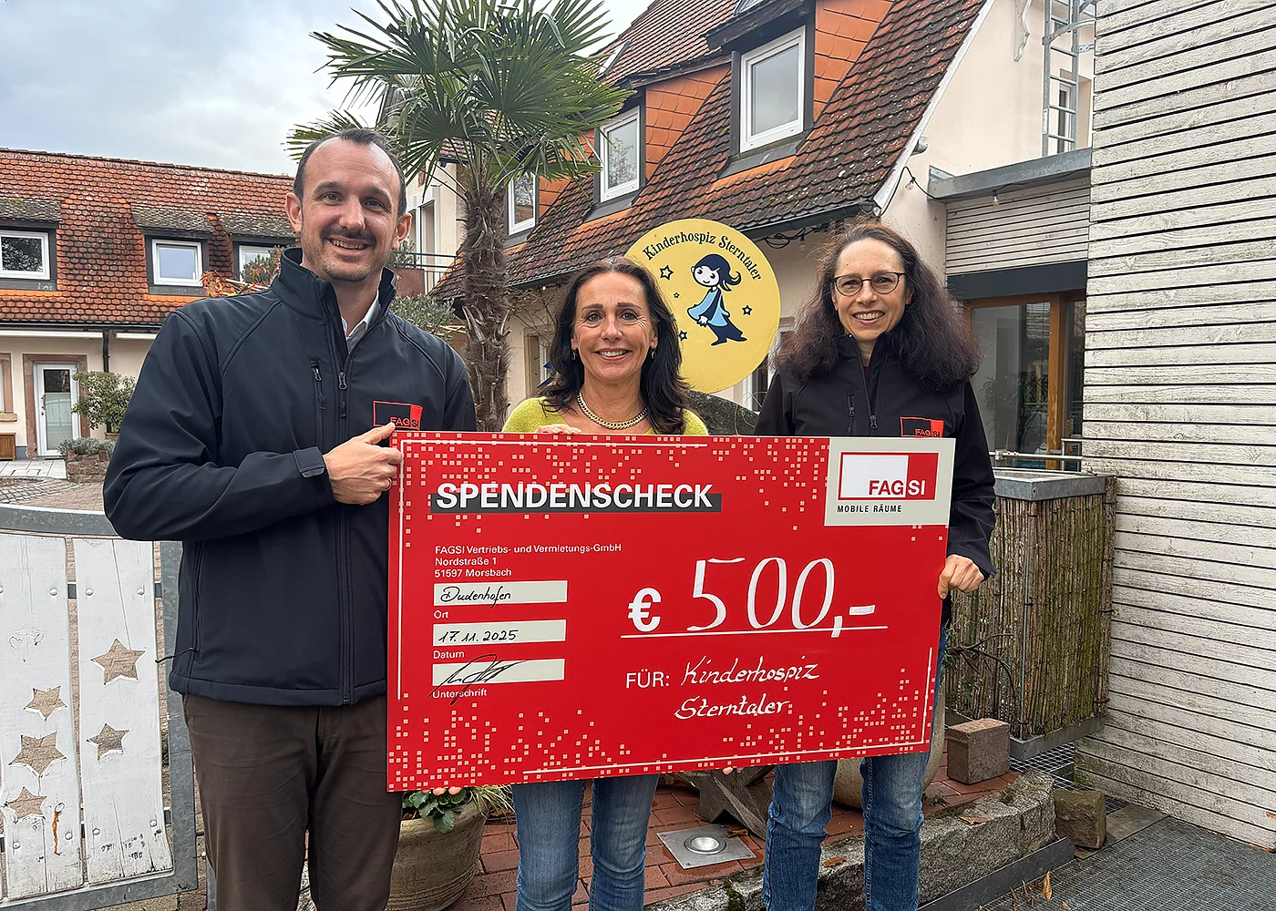 Die erste Spende wurde von unserer FAGSI Niederlassung Süd-West überreicht und ging an das Mannheimer Kinderhospiz Sterntaler e.V. Das Kinderhospiz Sterntaler bietet schwerkranken Kindern sowie ihren Familien umfassende Unterstützung. Im Mittelpunkt steht die liebevolle Betreuung, die es den Kindern ermöglicht, ihre verbleibende Zeit möglichst angenehm und geborgen zu erleben. Das Hospiz begleitet Familien nicht nur in der Krankheitsphase, sondern auch in der Trauerzeit nach dem Verlust eines Kindes. Neben der medizinischen und pflegerischen Versorgung werden vielfältige Angebote zur emotionalen Stärkung, Freizeitgestaltung und gemeinschaftlichen Erlebnissen bereitgestellt, damit die Familien Momente der Normalität und Freude trotz schwieriger Umstände erleben können.