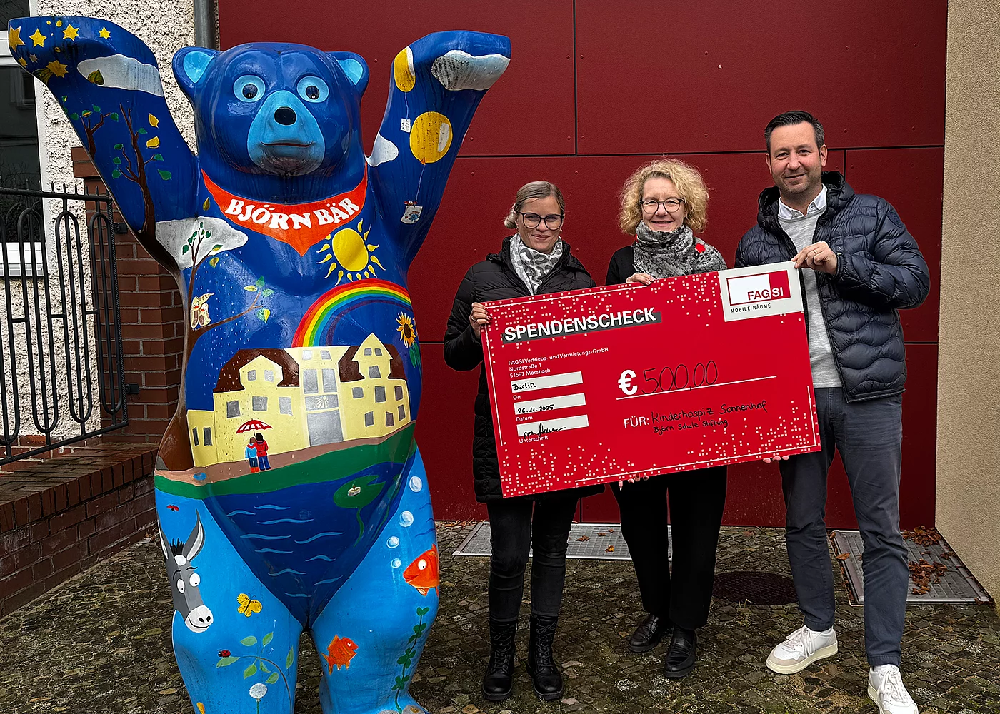 Seit 1996 steht die Björn Schulz Stiftung Familien mit lebensverkürzend erkrankten Kindern, Jugendlichen und jungen Erwachsenen zur Seite. Im Sonnenhof in Berlin-Pankow finden sie einen Ort, an dem Fürsorge, Ruhe und Menschlichkeit im Mittelpunkt stehen. Das Kinderhospiz bietet 12 Plätze sowie Familienapartments, damit Eltern und Geschwister nah bei ihrem Kind sein können. Therapeutische Angebote wie Kunst- und Musiktherapie schaffen wertvolle Momente des Ausdrucks und der Ruhe. Jährlich werden über 650 Familien unterstützt, nicht nur während der Krankheit, sondern auch in der Trauerzeit danach. Während die Finanzierung der medizinisch-pflegerischen Versorgung der Gäste größtenteils über die Pflegekasse erfolgt, ist die pädagogisch-therapeutische Begleitung der erkrankten Kinder und ihrer Angehörigen nur durch Spenden möglich. Umso mehr freut es uns, dass die FAGSI Niederlassung Nord diese wertvolle Arbeit unterstützt und 500€ direkt an den Sonnenhof spendet, um den Familien wertvolle Moment der Entlastung und Freude zu schenken. Frau von Damaros und Oliver Stevanovic haben die Spende persönlich an Frau Jessica Staiger von der Björn Schulz Stiftung übergeben. Im Anschluss gab es eine Führung durch den Sonnenhof, die bei allen Beteiligten einen besonders emotionalen Eindruck hinterlassen hat.