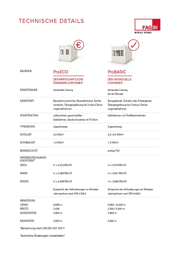 Ein Standardcontainer basiert auf den in der ISO-Norm 668 festgelegten Abmessungen, die bereits in den 1960er Jahren definiert wurden. Diese Größen orientieren sich am ersten international standardisierten 20-Fuß-Container mit 6,058 m Länge und 2,438 m Breite – bis heute die Basis für weltweite Seefracht. Auf diesem bewährten Prinzip baut auch der FAGSI ProECO auf. Als preisgünstige Lösung bietet er genau diese Maße und überträgt die Vorteile der genormten Containertechnik auf den Hochbau.