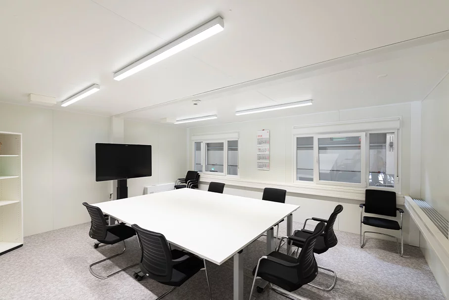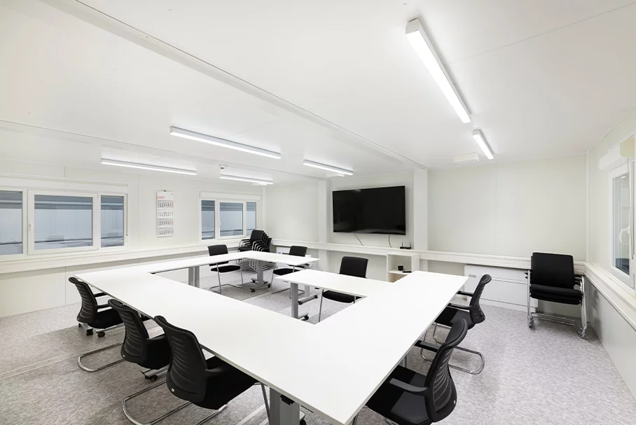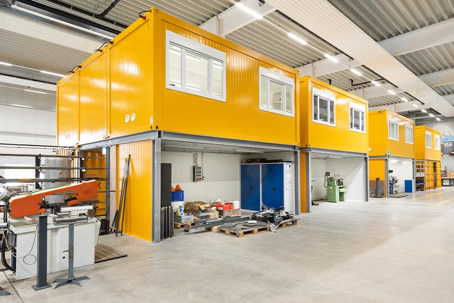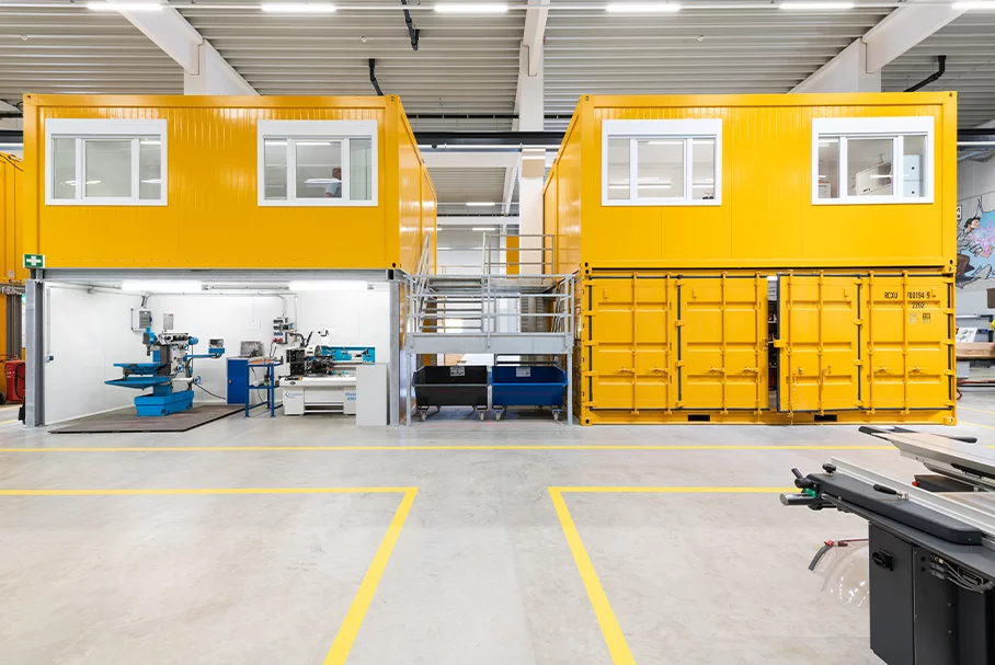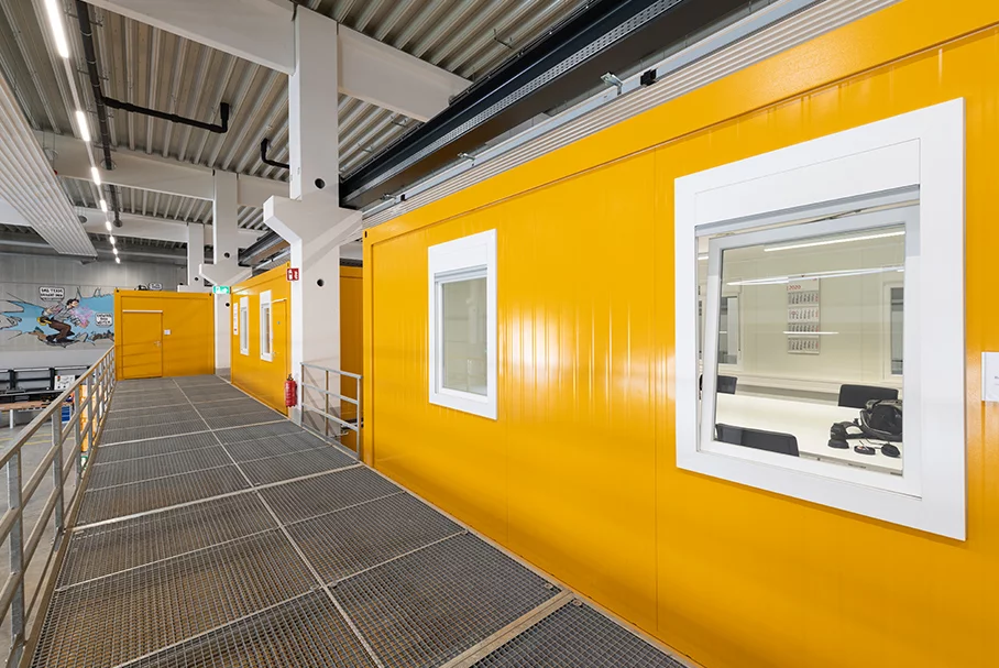 Die Firmengruppe Max Bögl mit Sitz in Sengenthal bei Neumarkt in der Oberpfalz gilt als einer der größten Ausbildungsbetriebe der Region. Im neuen Ausbildungszentrum werden über 300 Auszubildende und duale Studenten der Firmengruppe für ihr Berufsleben fit gemacht. Neben der Ausbildung von Jugendlichen wird das Zentrum auch der Weiterbildung von Fachkräften dienen. Unmittelbar in die Ausbildungshalle integriert wurde eine zweistöckige, insgesamt 295 qm große Anlage aus 20 FAGSI Kauf-Containern das Raumangebot um sechs rund 14 qm große Materiallager und sanitäre Anlagen für Frauen und Männer auf seiner EG-Fläche. Im OG sind zwei Büros, drei Besprechungsräume – zwischen 28 und 42 qm groß – sowie ein 28 qm großer Raum für Messtechnik untergebracht. Die Container der Erdgeschossebene sind in zwei Reihen an einem mittigen Durchgang platziert und mit weiteren Containern im OG überbaut. Diese Überbauung sowie der Wunsch der Bauherren nach drei zur Halle hin offenen „Werkstattkabinen“ erforderte die Ausbildung einer tragenden Stahlunterkonstruktion als Basis, die an die Containerabmessungen präzise angepasst werden musste. Die obere Etage wird über außenliegende Treppenanlagen erreicht. Die Container der Baureihe ProECO wurden zu insgesamt fünf kleineren, voneinander abgerückten Einheiten gruppiert – vier davon sind im OG über eine Podestplattform miteinander verbunden. Diese so erzeugte Kleinmaßstäblichkeit der Anlage wirkt sich optisch sehr positiv auf die „Haus-in Haus-Situation“ in der Halle aus. Die Metallfassaden sind im typischen „Max-Bögl-Gelb“ gestaltet und spiegeln das CI des Unternehmens signifikant wider. Innerhalb der Halle setzt die leuchtende Farbe einen sonnigen Akzent. Das Aufstellen der Container innerhalb eines geschlossenen Raums einer Halle war für FAGSI die größte Herausforderung bei dieser Bauaufgabe. So konnten die Container nur mithilfe eines Spezialkrans, der über eine nur geringe Ausladung verfügt, unter der verhältnismäßig niedrigen Hallendecke sicher transportiert und gestapelt werden.