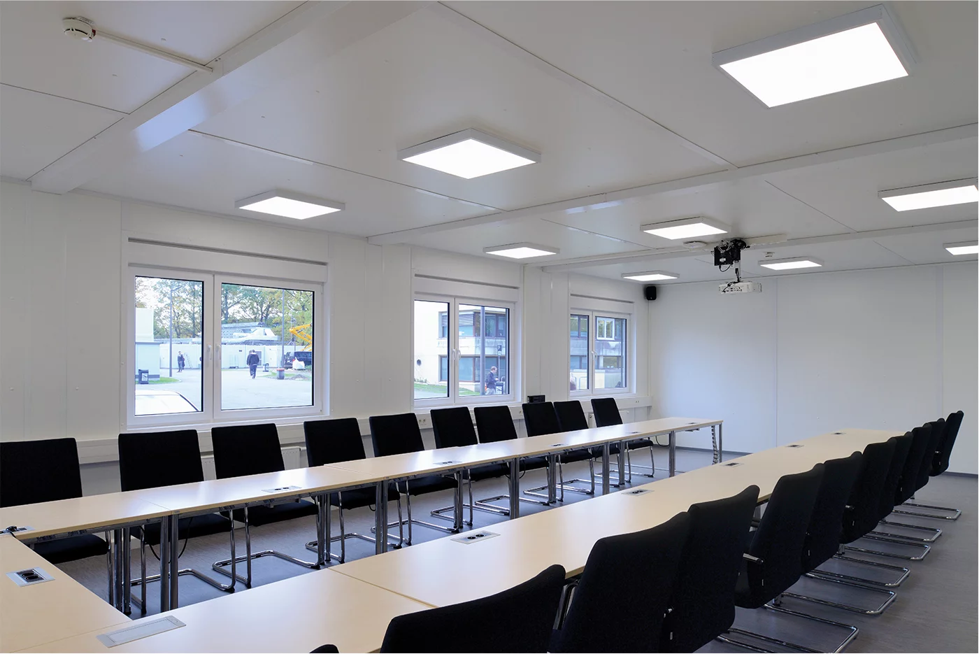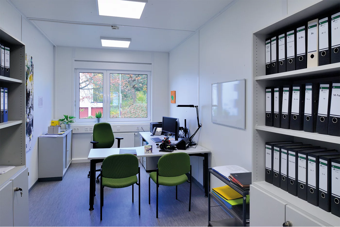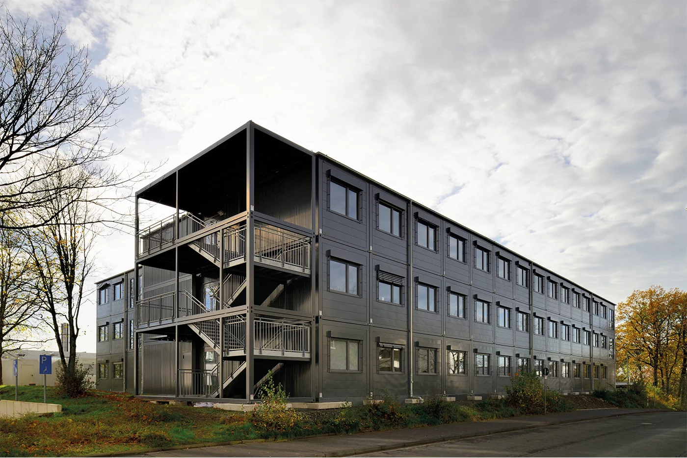 Der Bau- und Liegenschaftsbetrieb NRW am Standort Siegen beauftragte FAGSI im März 2017 mit dem Bau eines temporären Verwaltungsgebäudes für die Universität Siegen. Die Anforderung des 3-geschossige Verwaltungsgebäudes wurde im Nachgang der zuvor in Auftrag gegebenen Uni-Mensa am Campus Siegen gestellt. Für FAGSI war die Erstellung des temporären Bürogebäudes eine besondere Premiere: Zum ersten Mal ist die neue Produktlinie ProENERGY verbaut worden, dessen Einweihung Mitte Juli 2017 am Standort Campus Siegen stattfand. Mindestens zwei Jahre lang, wird das neue Verwaltungsgebäude als Interimslösung stehen bleiben. Büros, Küchen, sanitäre Anlagen, Besprechungsräume sowie Lager- und Technikräume finden auf 2.632qm Platz in dem neuen Bau. Für die Erschließung des Gebäudes sorgen zwei innenliegende Treppenhäuser, ein Aufzug und ein außenliegender Treppenturm. Das äußere Erscheinungsbild wird durch eine Glattblechfassade geprägt. Die lichte Raumhöhe von 2,75 m sowie die Einhaltung der Energieeinsparverordnung sind typisch für die ProENERGY-Baureihe, die nach deutscher Markenqualität von dem Schwesterunternehmen ProContain hergestellt wird.