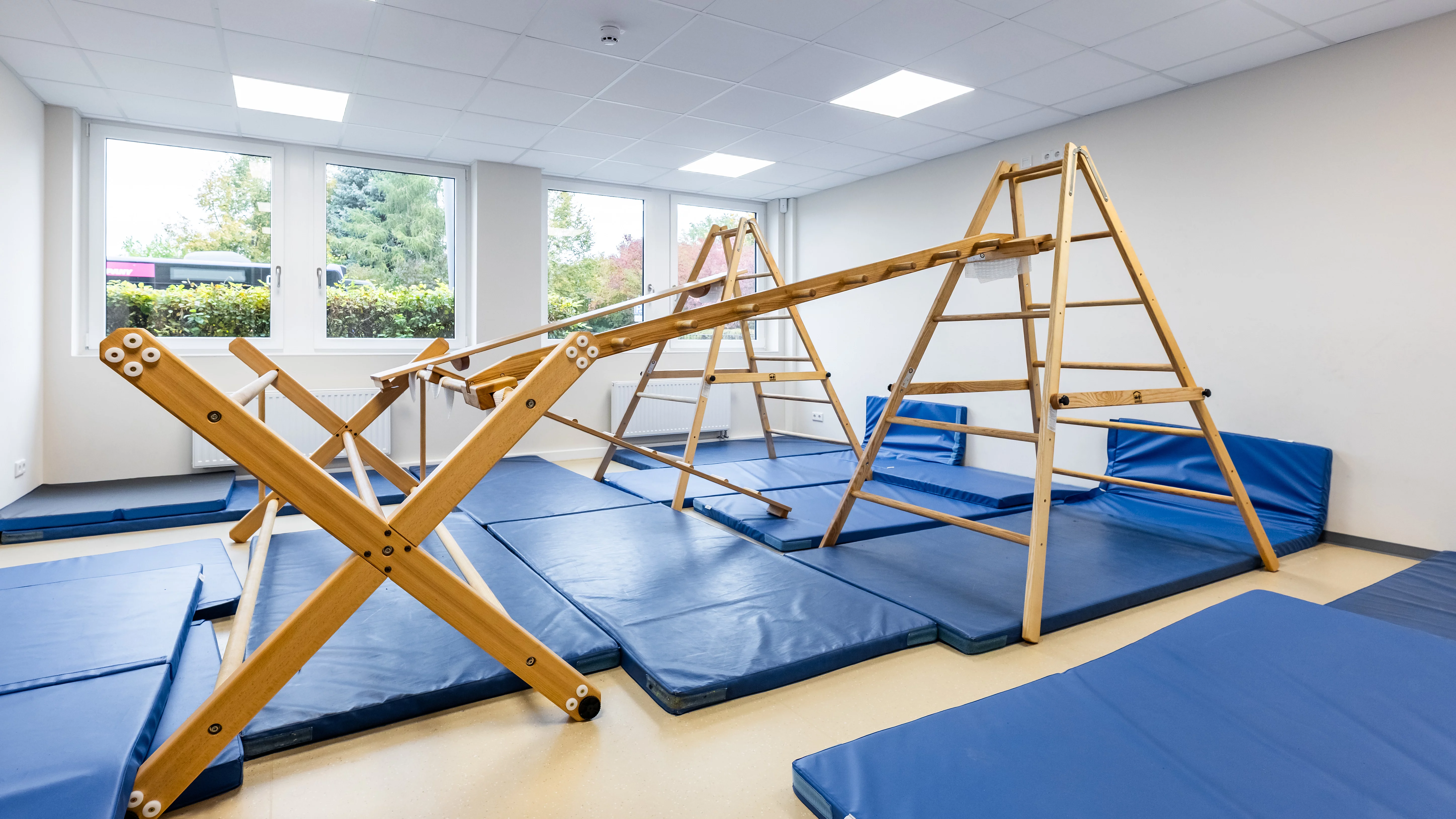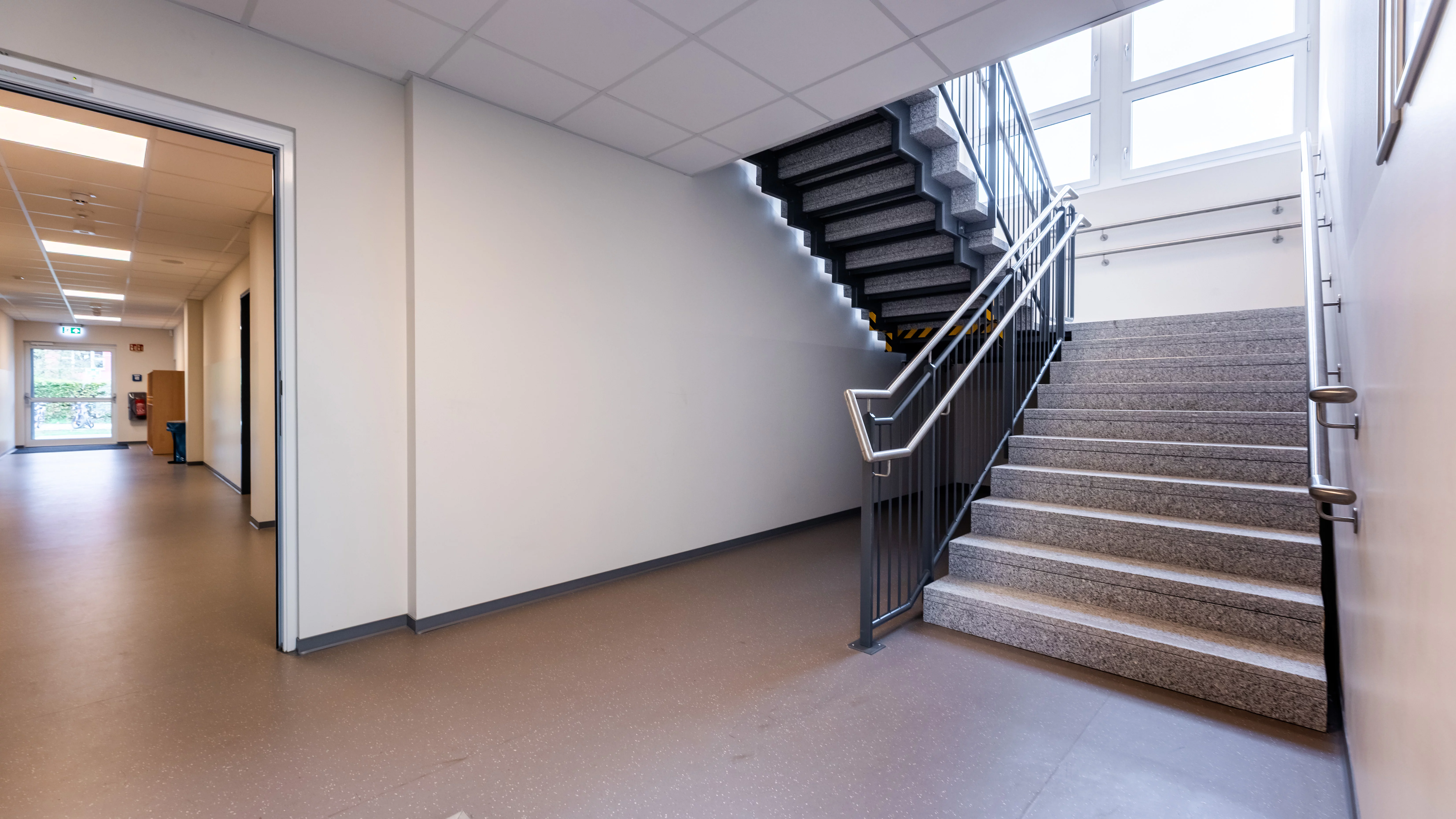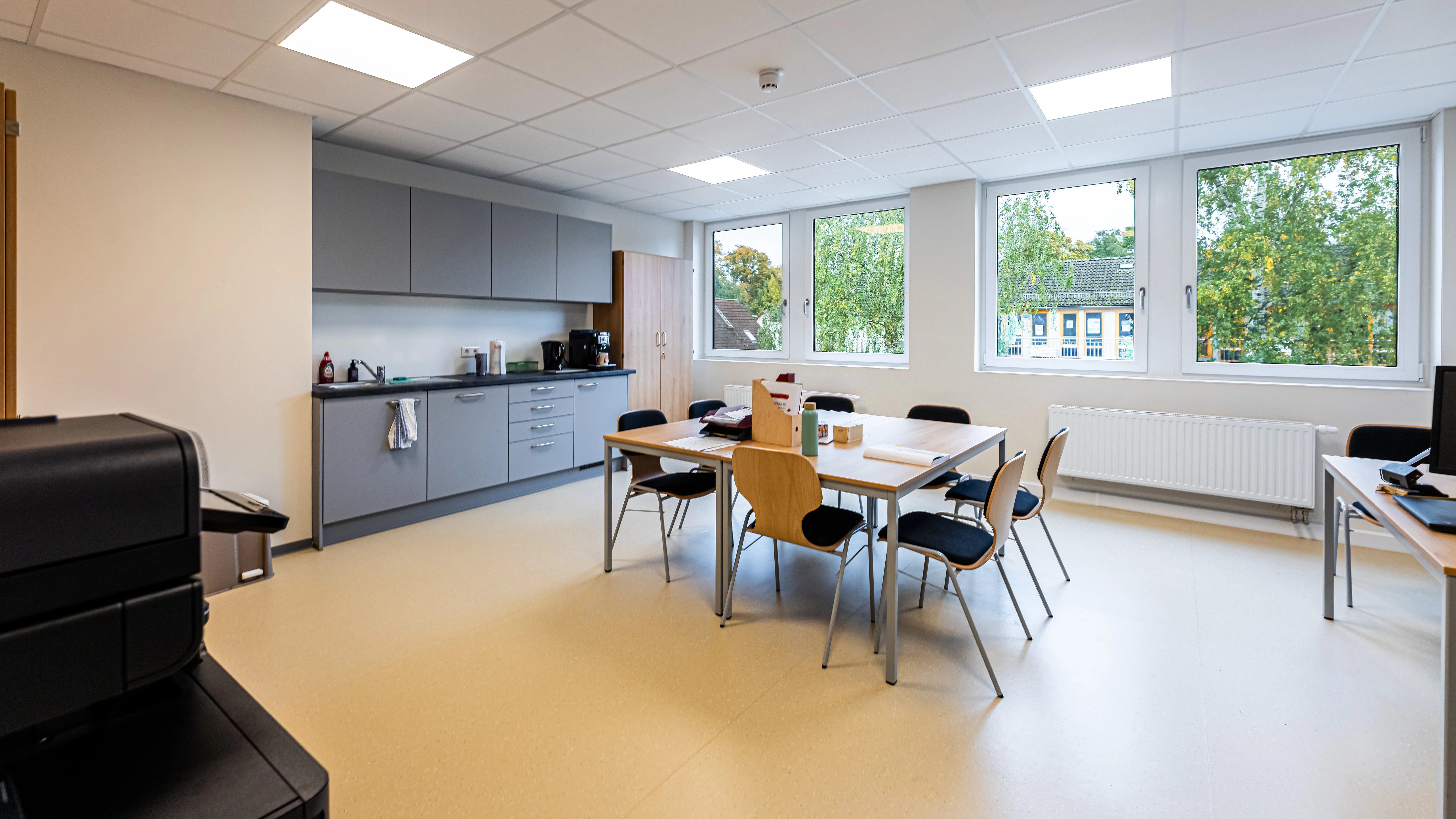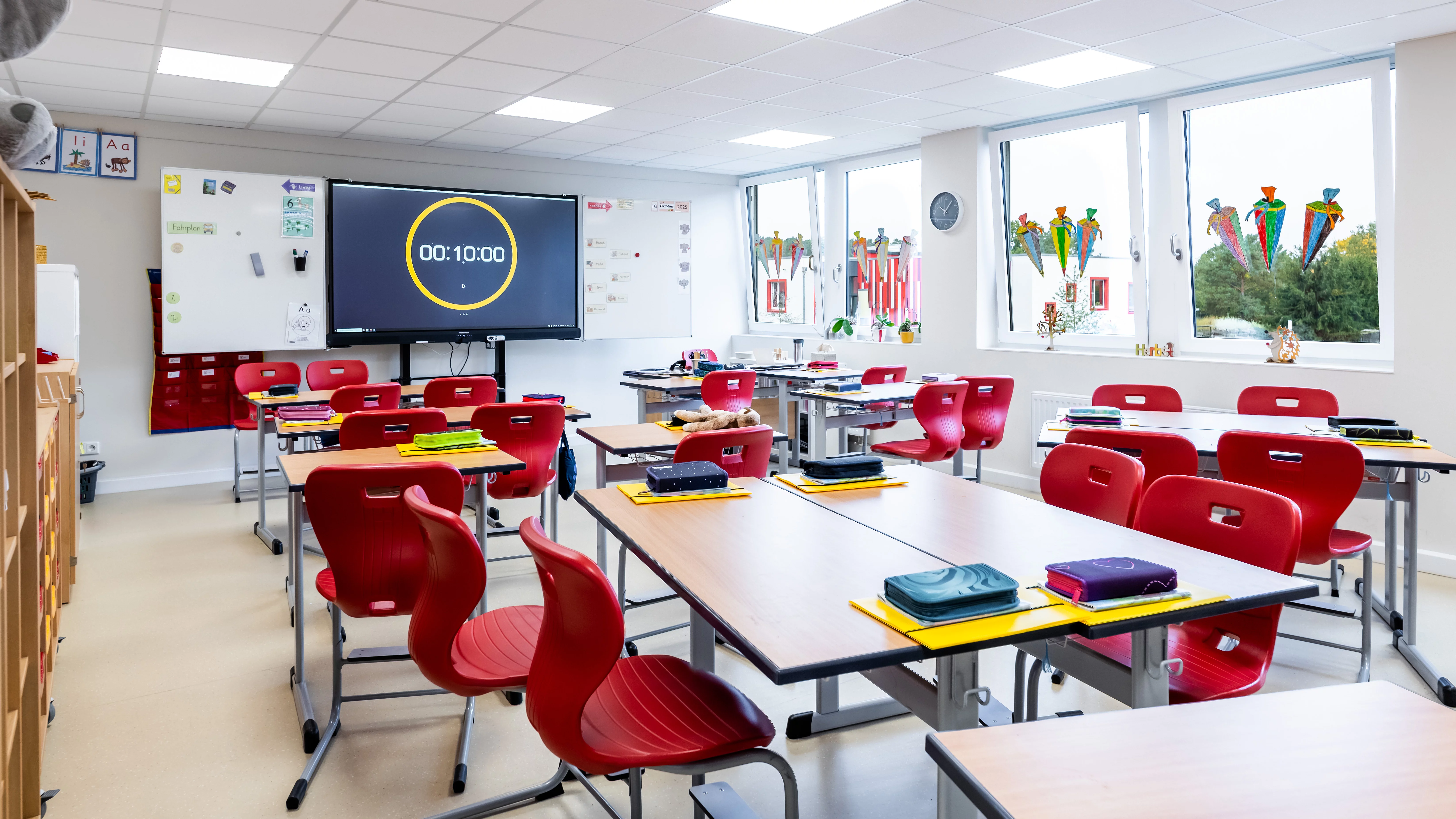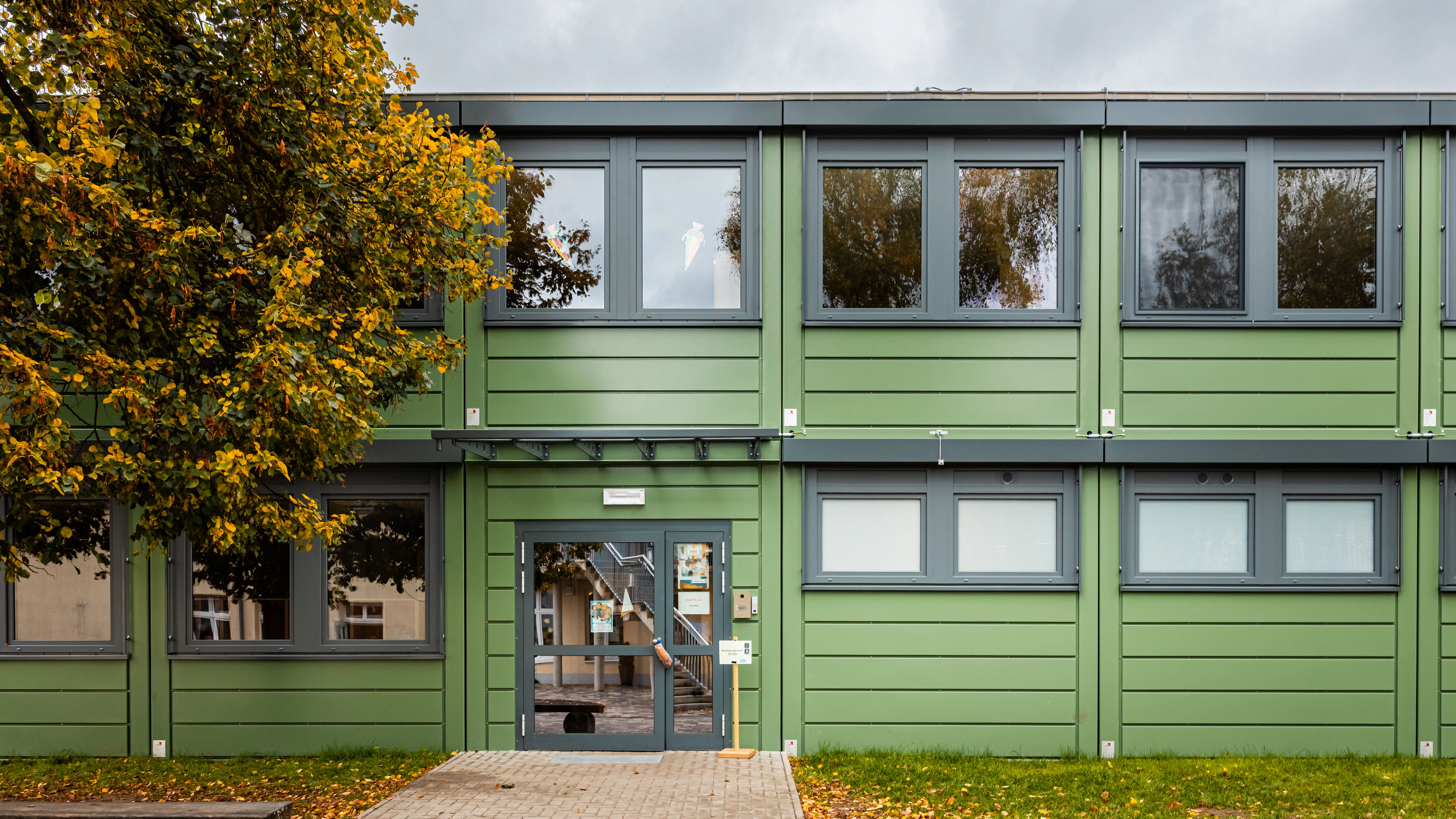 Die Anlage bietet helle, kindgerechte und flexible Räume, darunter einen barrierefreien Klassenraum, einen Bewegungsraum, einen Büroraum mit integrierter Küche, sowie eine komplett geflieste Sanitäranlage. Für die Containeranlage wurden alle notwendigen Genehmigungen eingeholt und ein Nachweis nach dem Gebäudeenergiegesetz (GEG) erbracht, sodass das Gebäude dauerhaft genehmigungsfähig ist. Eine moderne Brandmeldeanlage sorgt für Sicherheit, während der EDV-Anschluss die Schule direkt digital anschlussfähig macht. Beheizt wird das Gebäude über eine Warmwasserheizung, die an das bestehende Heizsystem der Schule angeschlossen ist. Gestalterisch greift die Anlage das Farbkonzept der Grundschule sowohl im Innen- als auch im Außenbereich auf. Außerdem sorgt ein durchgehend verlegter Kautschukboden, für eine Trittschalldämmung und eine angenehme Lernatmosphäre.