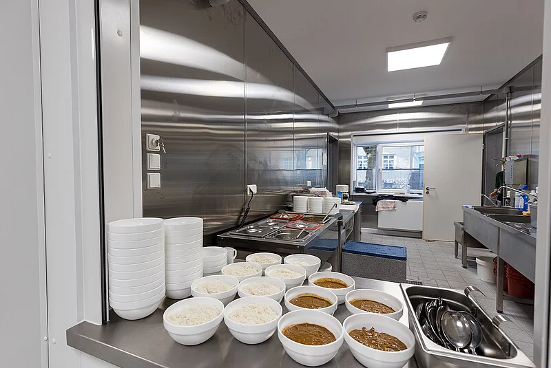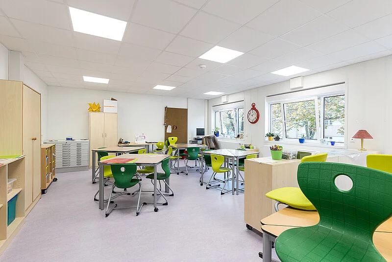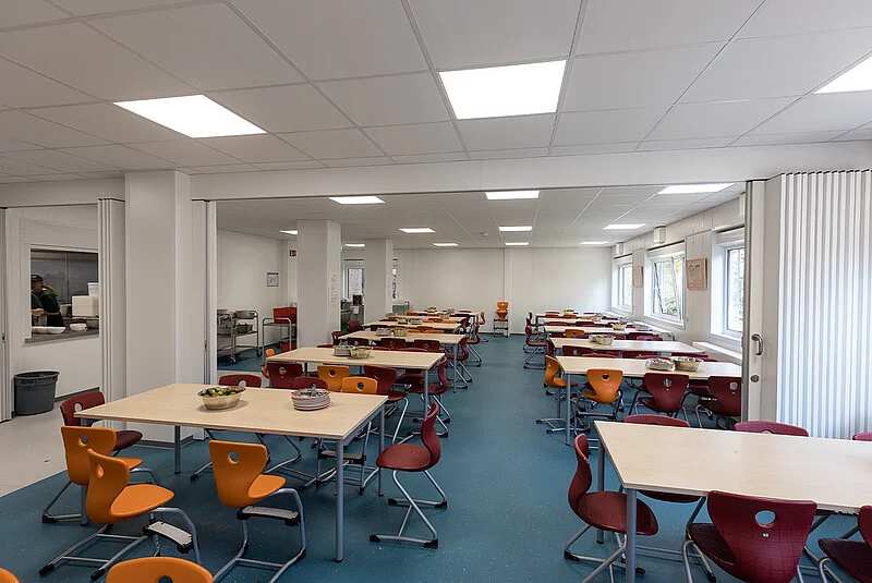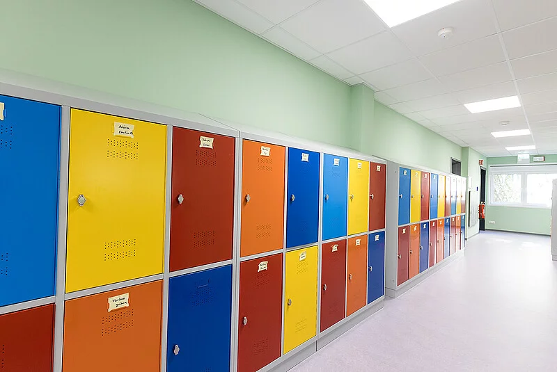 Außen schick in Bordeauxrot und Creme – innen hell und freundlich. Das neue Mensa- und Hortgebäude der Christoph Földerich Schule bricht eine Lanze für hochwertigen, modernen Containerbau. Denn nicht nur die schnelle Planungs- und Bauzeit sowie das gute Preis-Leistungs-Verhältnis überzeugten den Auftraggeber, sondern auch die ansprechende Gestaltung und die hohe Qualität. „Die Zusammenarbeit mit dem Bezirksamt Spandau war sehr gut. Dadurch, dass wir nicht nur als Generalunternehmer, sondern zusätzlich auch als Planer beauftragt waren, standen wir im ständigen Austausch“, berichtet Erik Rafka, der das Projekt seitens FAGSI begleitet hat. „TGA-Planung, Bemusterung, Statik inklusive Prüfstatik, EnEV-Berechnung, Rohrnetzberechnung, Lichtberechnung, Grundrisse, Ansichten und Schnitte – das alles haben wir bei diesem Projekt aus einer Hand mit abgedeckt und direkt mit dem Kunden abgestimmt.“ Der Neubau wurde aus 54 Containern der Baureihe ProENERGY zusammengefügt. Diese Baureihe wurde speziell für Standzeiten über zwei Jahre und höchste Ansprüche konzipiert. 940 qm Bruttogrundfläche verteilen sich auf drei Geschosse. Im Erdgeschoss befindet sich die Schulkantine mit Warmausgabe und Spülküche, so dass alle Schüler ihr Anrecht auf ein freies Schulessen geltend machen können. In den beiden Obergeschossen ist der komplette Schulhort der Christoph Földerich Schule angesiedelt worden, so dass die im Bestandsgebäude freigewordenen Räume als Klassenzimmer umgenutzt werden können. Diese funktionale Aufteilung wird durch die farbliche Zweiteilung der Fassade unterstrichen. „Wir haben hier eine Anlage komplett schlüsselfertig vom Tiefbau bis zum Galabau und inklusive aller nötigen Planung innerhalb von 3 Monaten erstellt und mangelfrei übergeben. Man könnte sagen, mit diesem Projekt haben wir unsere Reifeprüfung bestanden“, freut sich Erik Rafka.