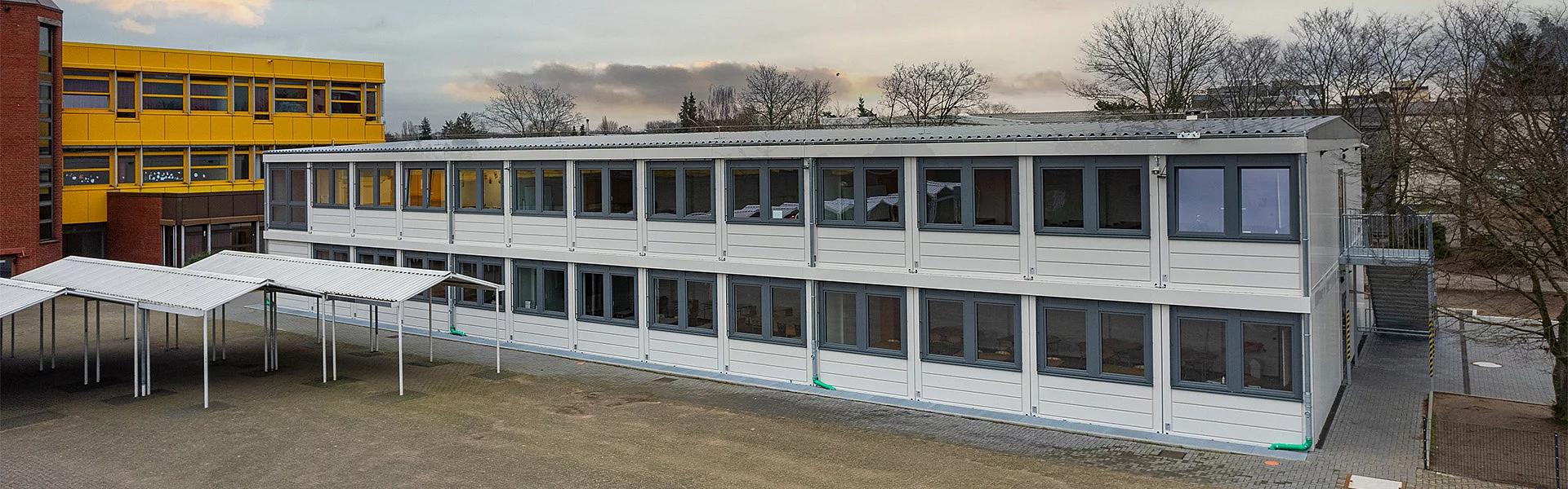 Bis zur Realisierung eines langfristigen Erweiterungsbaus oder einer endgültigen Aufstockung dient diese temporäre Raumlösung mitten in einem Wohngebiet als Interim für das Gymnasium Köln-Pesch. Aus 64 Containern der FAGSI Baureihe ProENERGY entstand in nur achtzehn Wochen Bauzeit ein zweigeschossiges Schulgebäude mit einer Gesamtfläche von 1143 Quadratmetern.