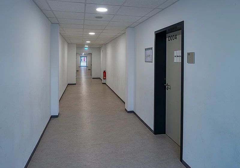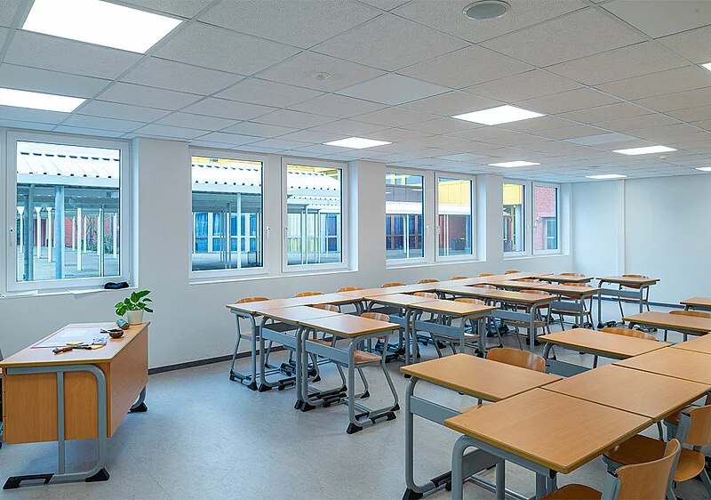 Spezielle Vorrüstungen für die nachträgliche Nutzung als naturwissenschaftliche Räume unterstreichen die Anpassungsfähigkeit an zukünftige pädagogische Anforderungen. In den kommenden Sommerferien werden drei Fachräume für Physik eingerichtet, die zurzeit als Klassenraum zwischen genutzt werden. Zusätzlich sind im Interim sieben weitere Klassenräume untergebracht. Das Schulgebäude bietet somit einen ausgewogenen Raum für eine Kombination aus akademischen und praktischen Aktivitäten. Zu den besonderen Merkmalen des Gebäudes gehört eine moderne Infrarot-Deckenheizung, die für eine effiziente und komfortable Beheizung sorgt. Die abgehängte Decke trägt nicht nur zur Ästhetik bei, sondern unterstützt auch die akustische Isolierung und verbessert die Lernumgebung. Darüber hinaus gibt es voll ausgestattete Sanitäranlagen und eine Lehrerküche, die die Zubereitung von Mahlzeiten ermöglicht und Raum für Pausen und Besprechungen des Lehrpersonals bietet.