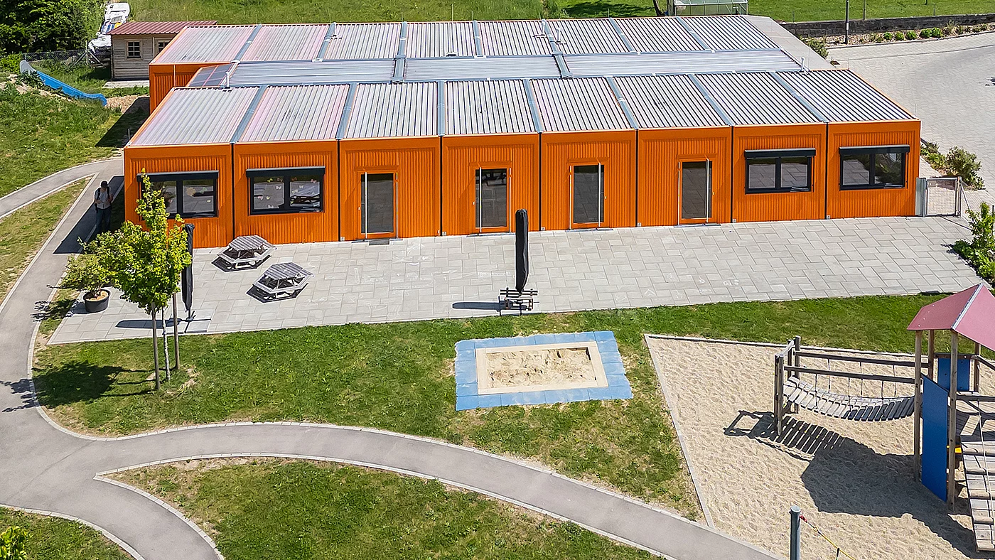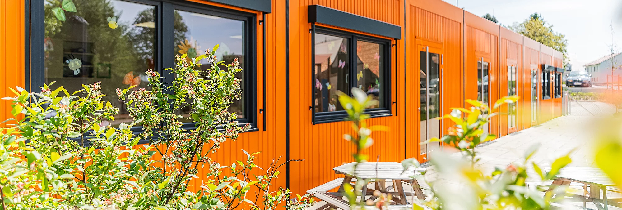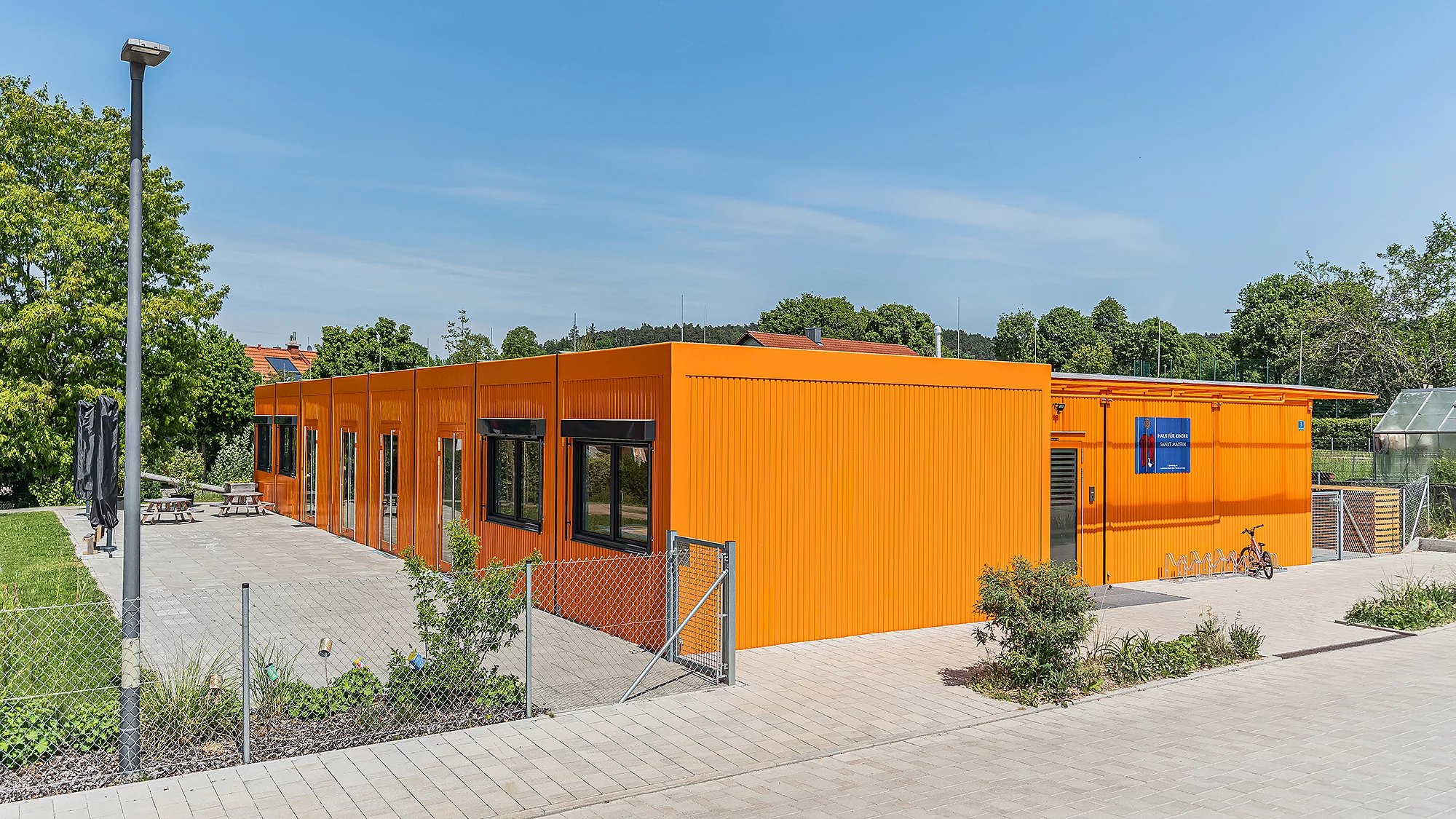 Mit dem Neubau der Kita St. Martin in Aresing ist ein moderner Bildungs- und Begegnungsort entstanden, der Pädagogik, Flexibilität und Umweltbewusstsein in Einklang bringt. Auf einer Fläche von 333qm wurde aus 19 Containern ein eingeschossiger Kindergarten errichtet. Neben einer ansprechenden Außengestaltung hat der Kindergarten nun zwei große Küchen, zwei Gruppenräume inklusive Schlafsaal, einen Bewegungsraum und ein großes Glasvordach, um eine helle fröhliche Atmosphäre zu gewährleisten. Für den Neubau kamen FAGSI ProENERGY Container zum Einsatz, die alle Anforderungen des Gebäudeenergiegesetzes (GEG) erfüllen. Durch den Einsatz regenerativer Energien und moderner Heizungs- und Anlagentechnik entsteht ein energieeffizientes Gebäude mit geringen Betriebskosten. Besonders für Kindergärten bedeutet dies ein nachhaltiges und gesundes Raumklima, das den Kindern eine angenehme Lern- und Spielatmosphäre bietet.