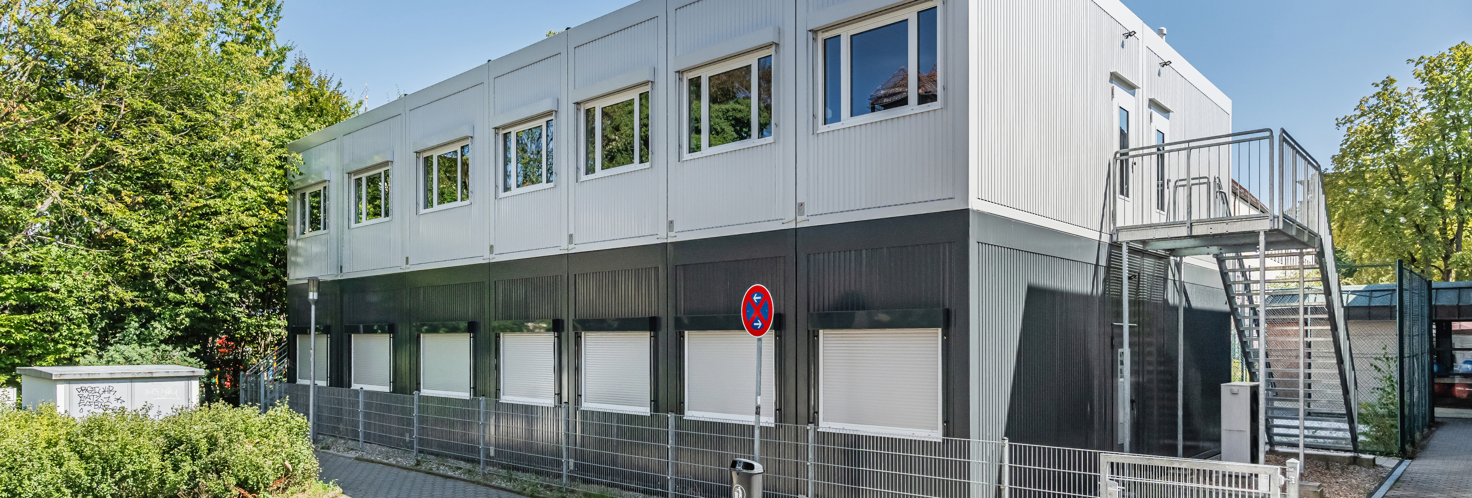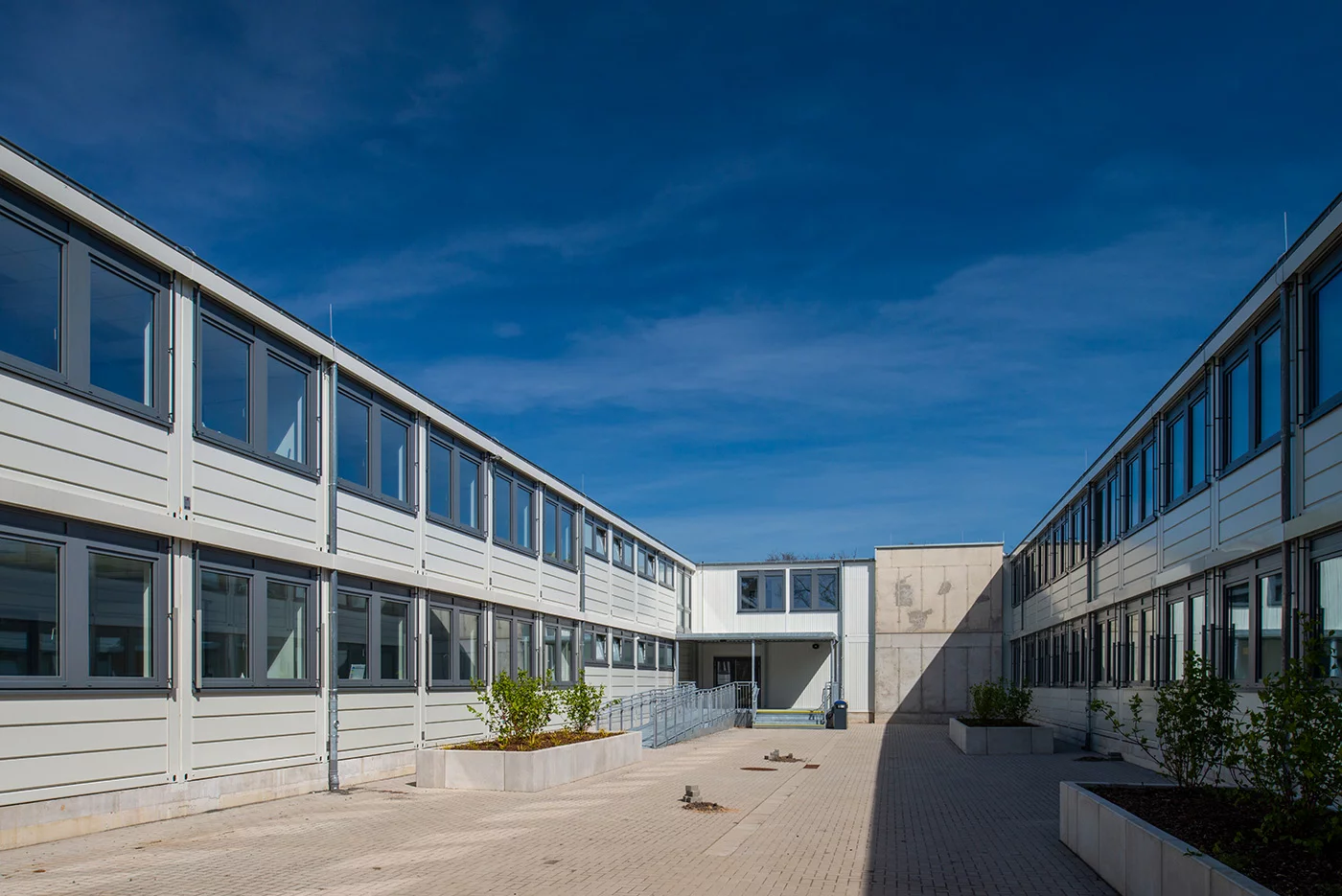 Parallel findet direkt nebenan die Generalinstandsetzung der Edith-Stein-Realschule statt. Auch hier dient ein Containergebäude von FAGSI als Interimslösung während der Bauphase und ermöglicht ungestörten Unterricht. Die Realschule erhielt ein Interimsgebäude mit insgesamt 3.530 qm verteilt auf 2 Geschosse. Dafür wurden zwischen dem 24. Mai und 7. Juni letzten Jahres 80 weitere Container geliefert und montiert.
