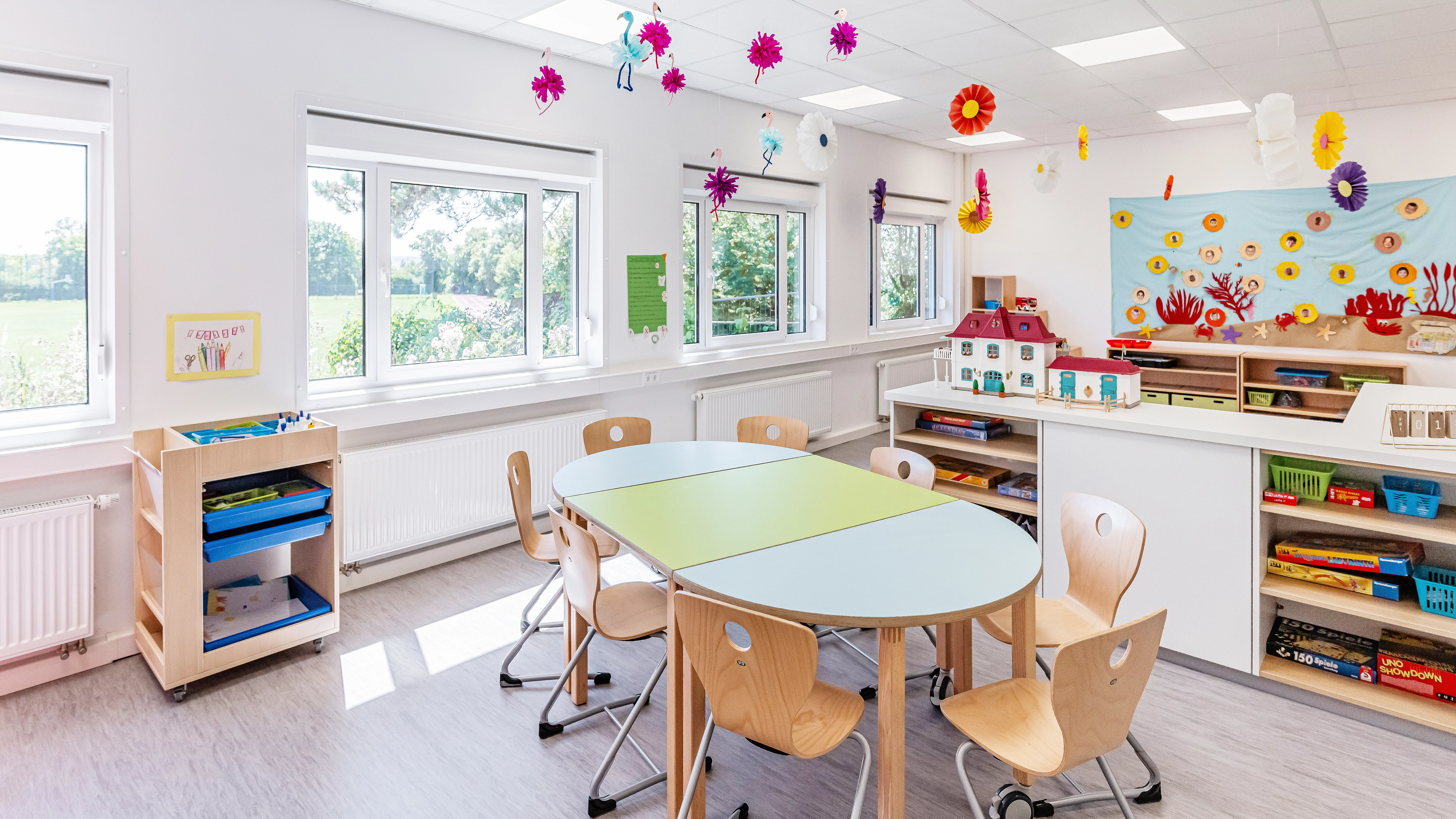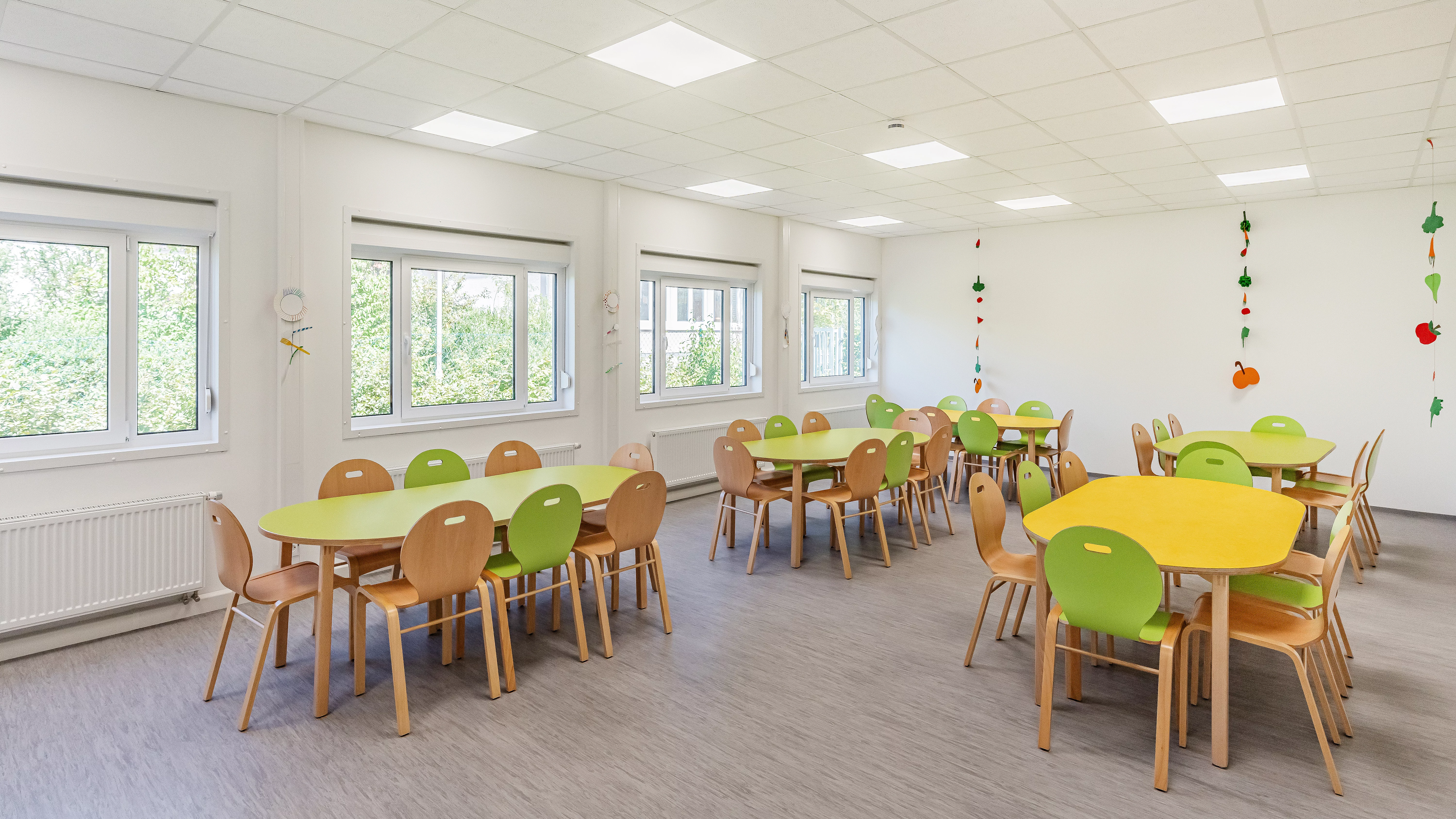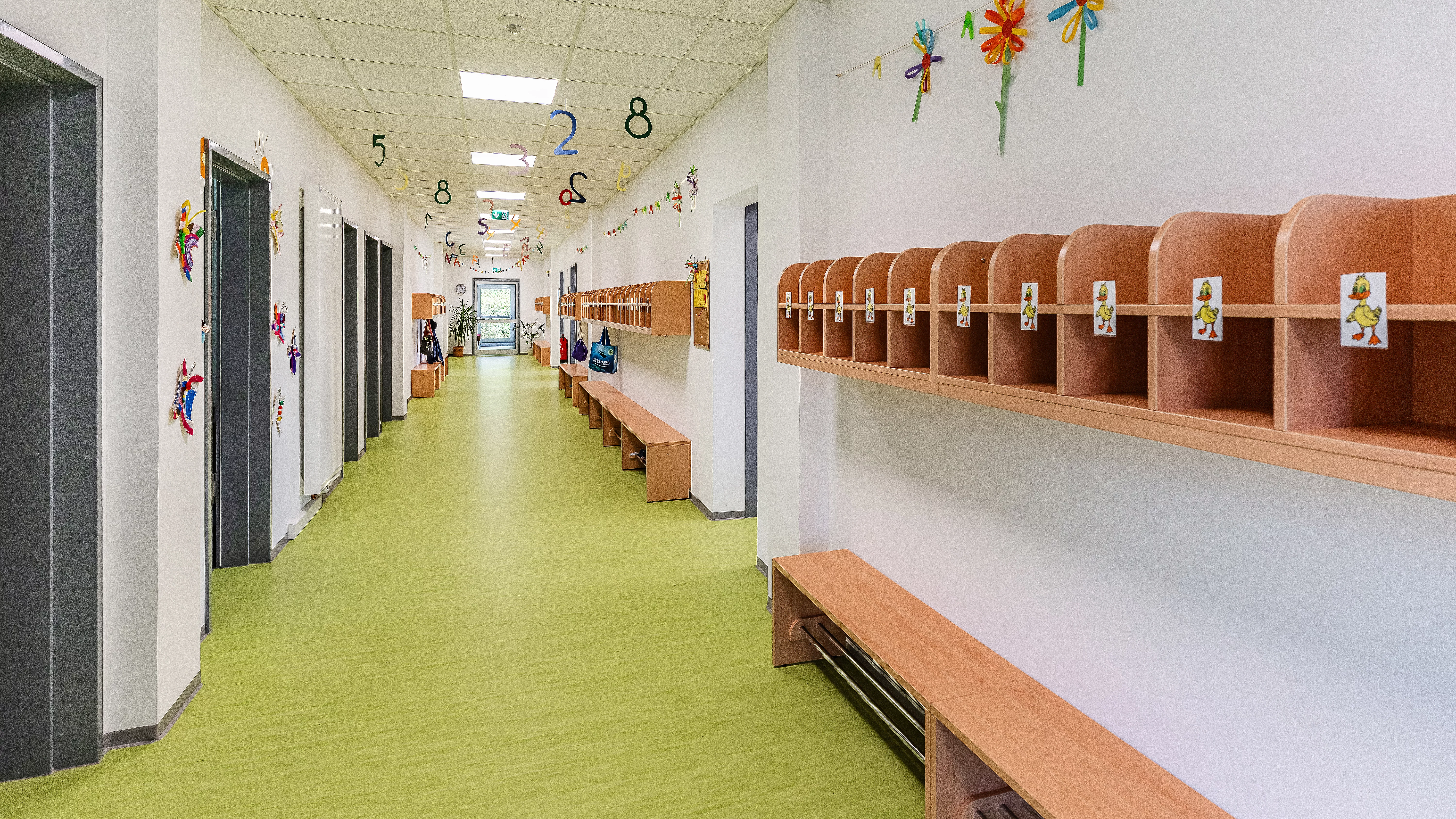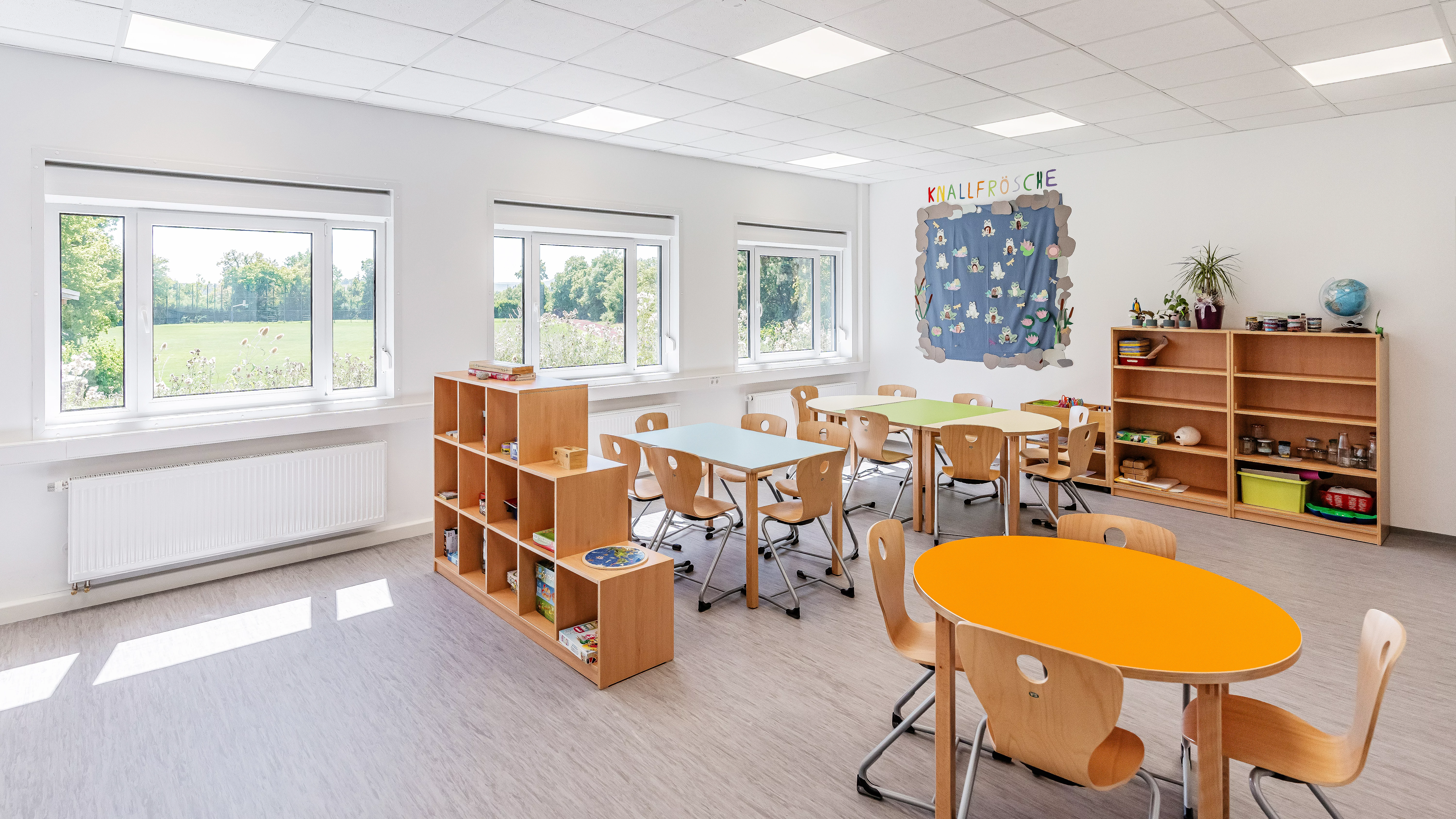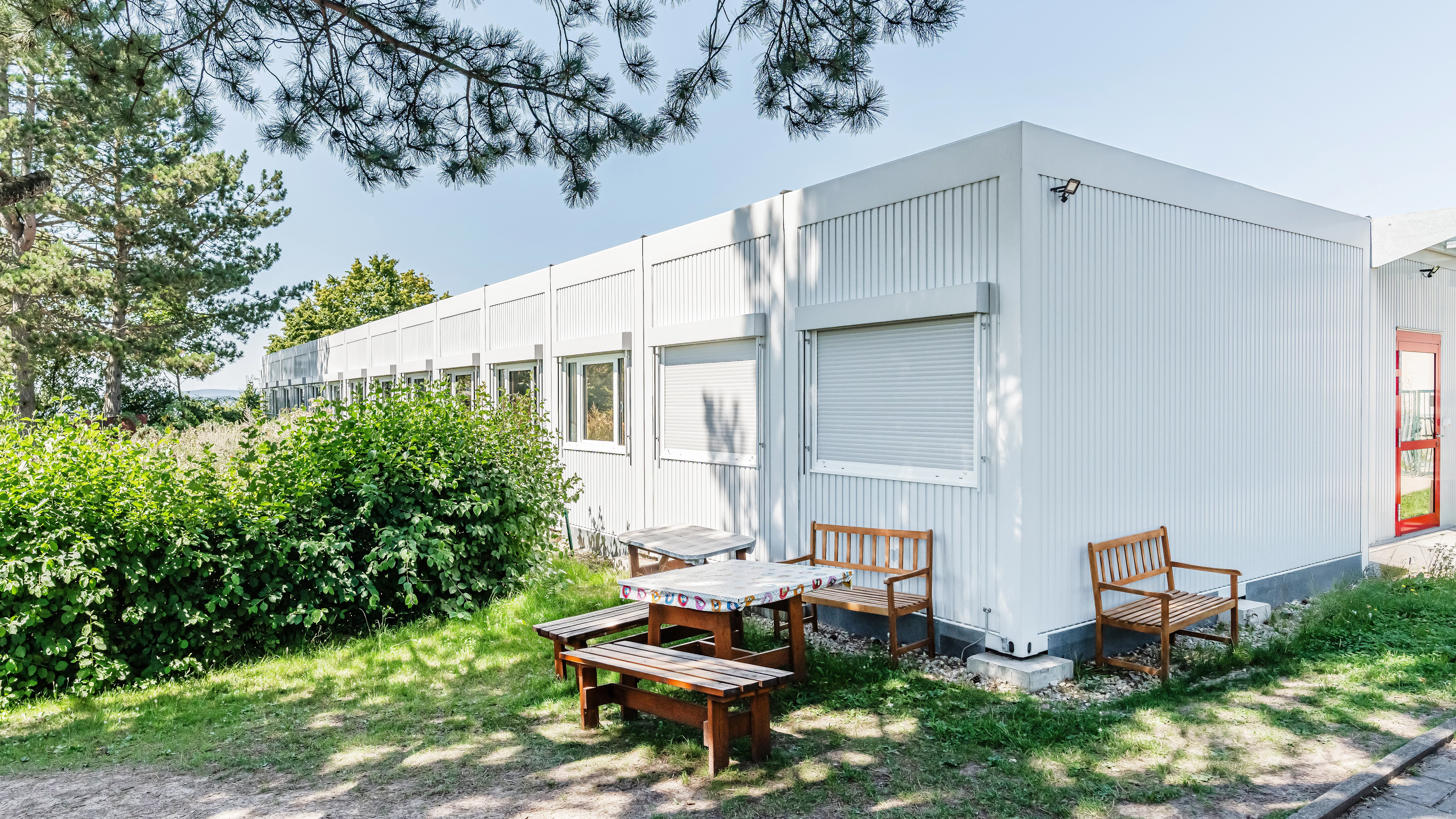 Die Anlage bietet Platz für bis zu 75 Kinder in drei Gruppenbereichen und bietet so ausreichend Fläche für die Hausaufgabenbetreuung und zum Spielen. Außerdem, umfasst der Neubau einen Speisesaal inklusive extra großer Küche, um eine tägliche Mittagsversorgung zu gewährleisten. Ergänzt wird das Raumkonzept durch Personalräume und Sanitärbereiche. Eine Luft-Wasser-Wärmepumpe sorgt für eine energieeffiziente und umweltfreundliche Beheizung. Da der Kinderhort direkt neben der Grundschule St. Johannis realisiert wurde, haben die Kinder und Eltern nur einen kurzen Weg zurückzulegen. Mit dieser flexiblen Containerlösung konnte FAGSI in nur 10 Wochen den dringend benötigten Betreuungsraum schaffen und der Grundschule St. Johannis eine funktionale und kindgerechte Übergangslösung zu Verfügung stellen.