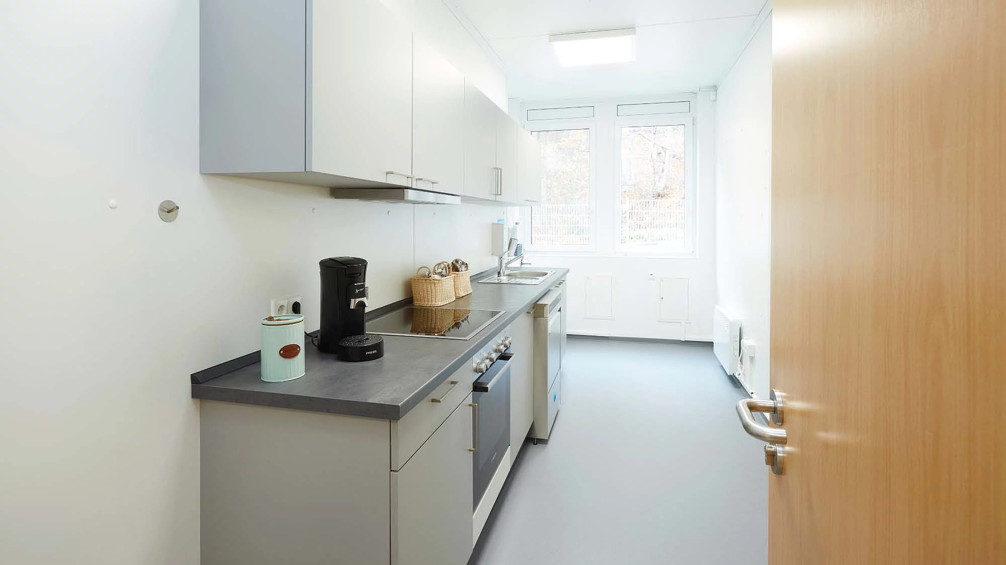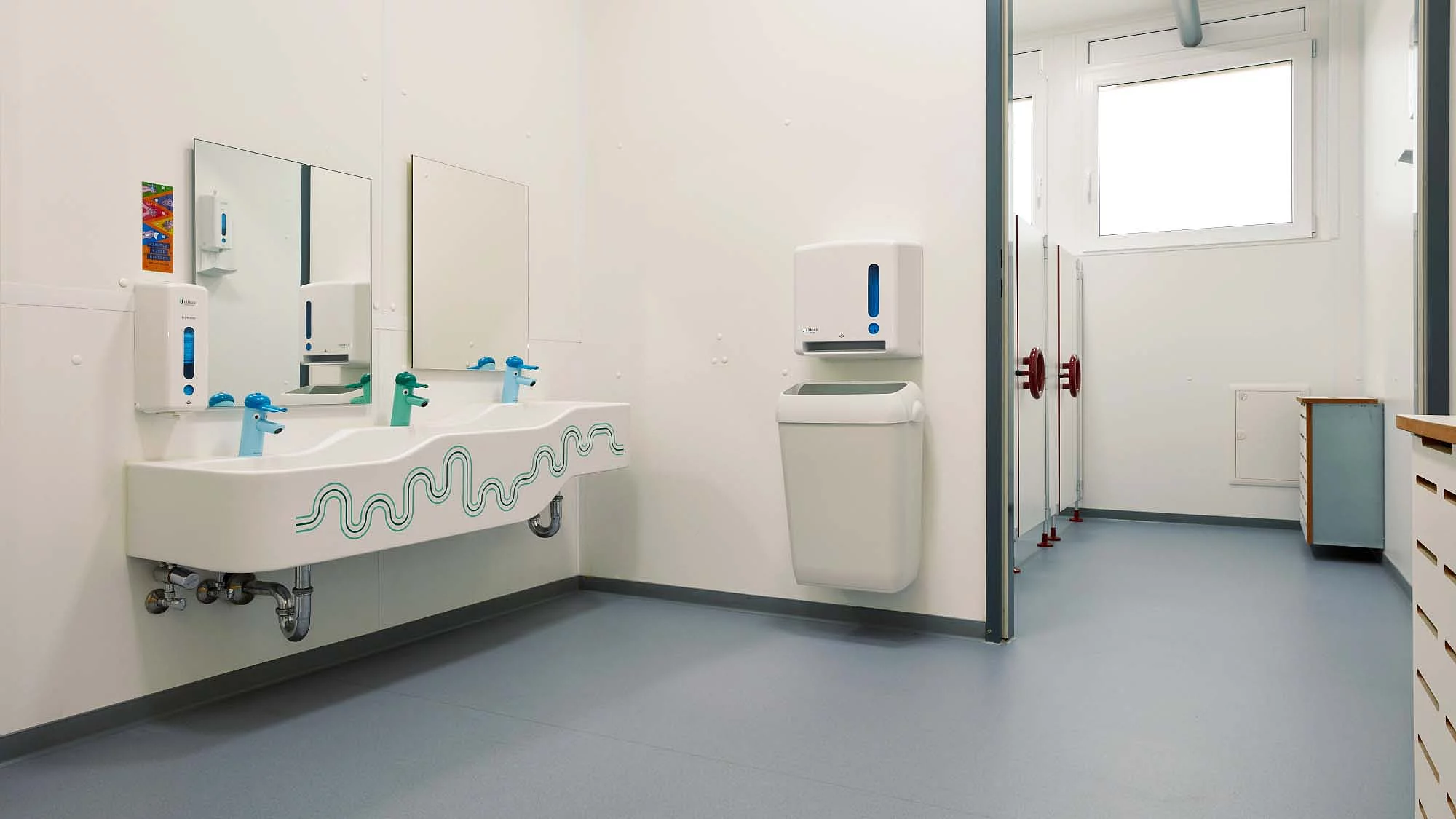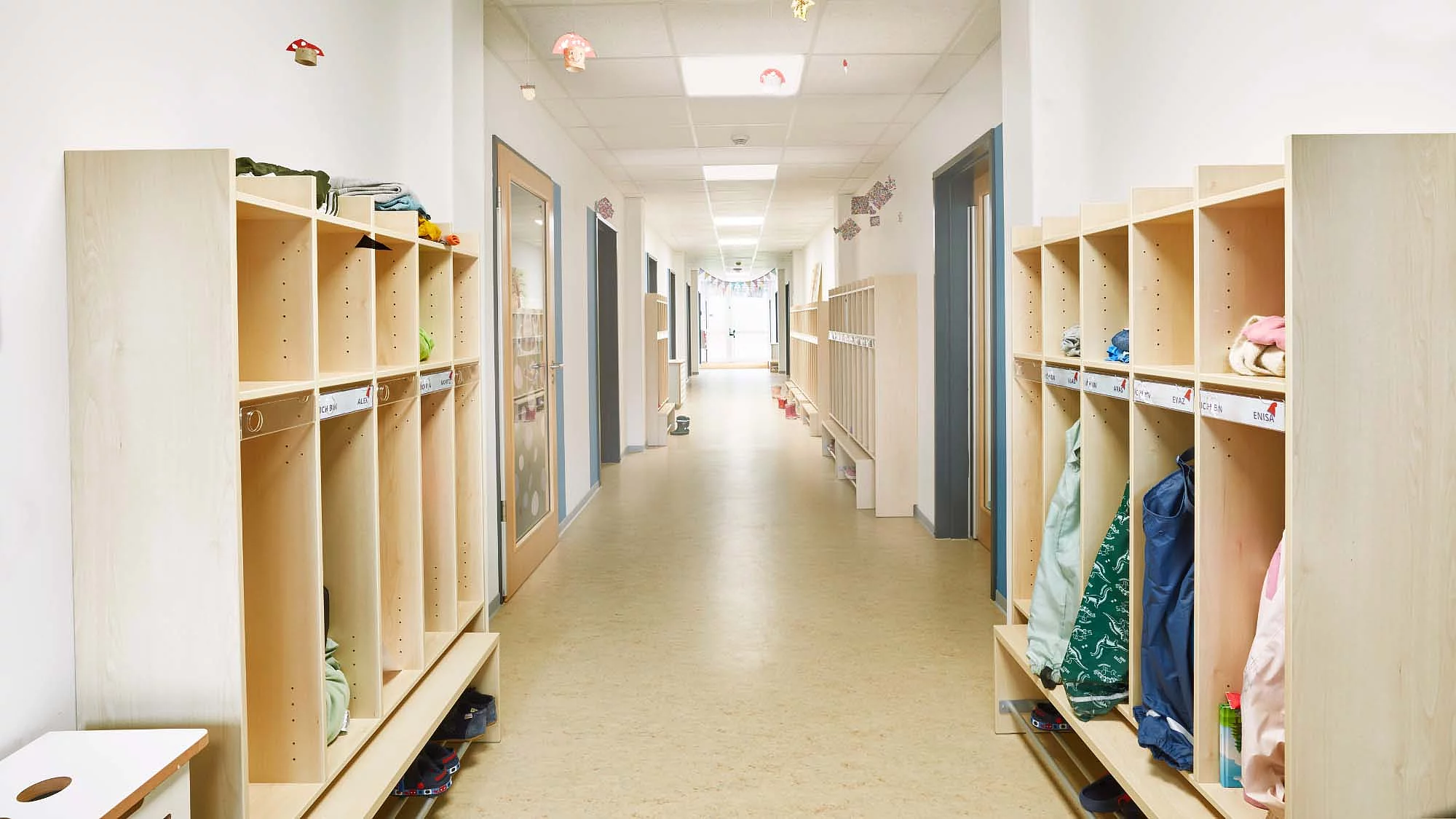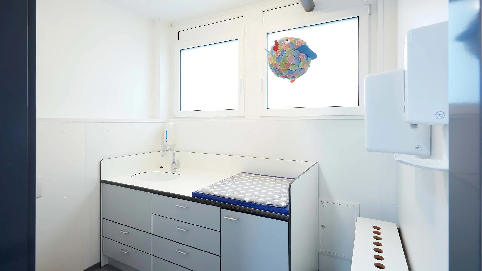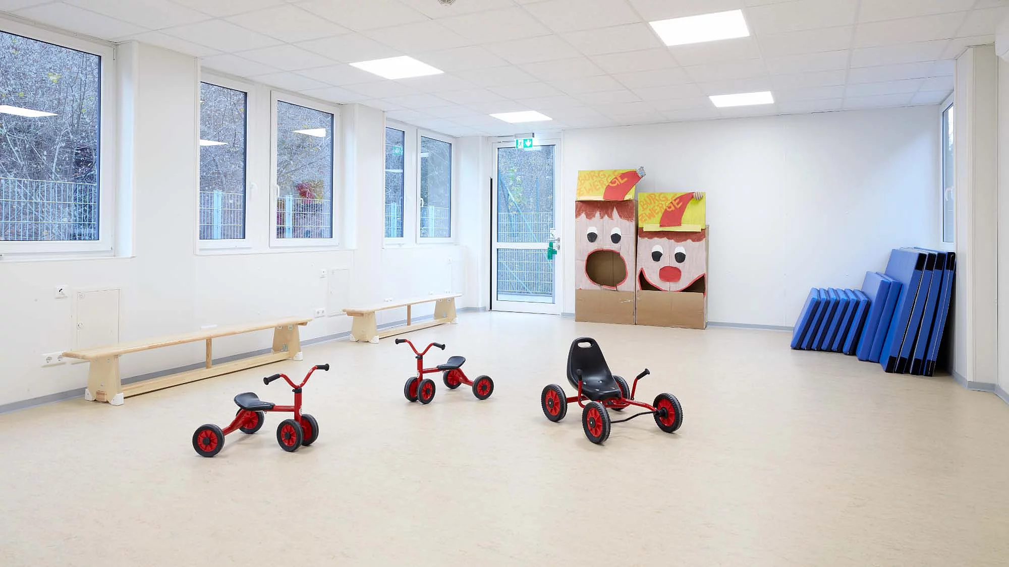 Das Raumkonzept der Kita wurde gezielt auf die Bedürfnisse von zwei Betreuungsgruppen ausgelegt und verbindet pädagogische Anforderungen mit funktionaler Effizienz. Auf den 410 m² entstanden ein strukturiertes Gebäude, dass sowohl Rückzugsmöglichkeiten bietet als auch Raum für gesellschaftliche Aktivitäten. Herzstück der Anlage sind zwei große Gruppenräume, die genug Platz zum Spielen und Lernen ermöglichen. Ergänzt werden die Gruppenräume durch einen Wickelraum, eine kindgerechte Sanitäranlage und einer Küche. Ein kleiner geschützter Außenbereich erweitert das pädagogische Angebot um zusätzliche Bewegungs- und Aufenthaltsflächen im Freien. Die Container wurden so angeordnet, das helle, freundliche Räume entstehen und große Fensterflächen sorgen für ausreichend Tageslicht, perfekt um die Entwicklung der Kinder zu unterstützen. Mit der Baureihe ProEnergy setzt FAGSI auf eine besonders hohe Energieeffizienz im temporären Containerbau. Das Gebäude erfüllt die gesetzlichen Anforderungen des Gebäudeenergiegesetzes (GEG) und ist mit moderner Heizungs- und Anlagentechnik ausgestattet.