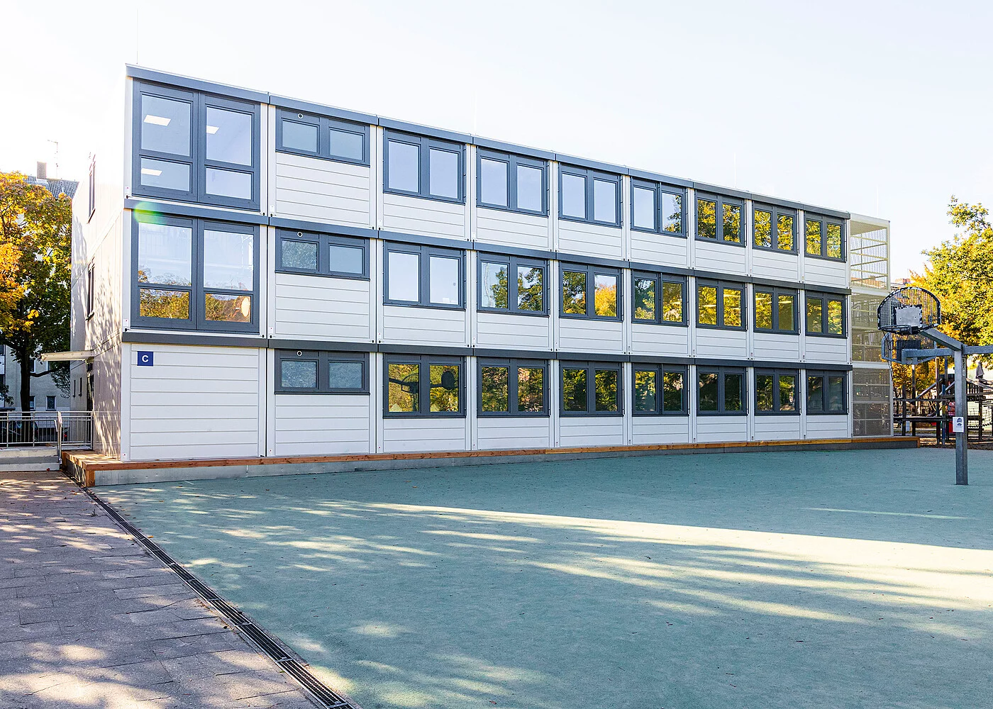 Für die sanierungsbedürftige Kurt-Tucholsky-Grundschule – die erste „Musikalische Grundschule“ im Bezirk Mitte – wurde ein moderner temporärer Schulstandort in Containerbauweise realisiert.