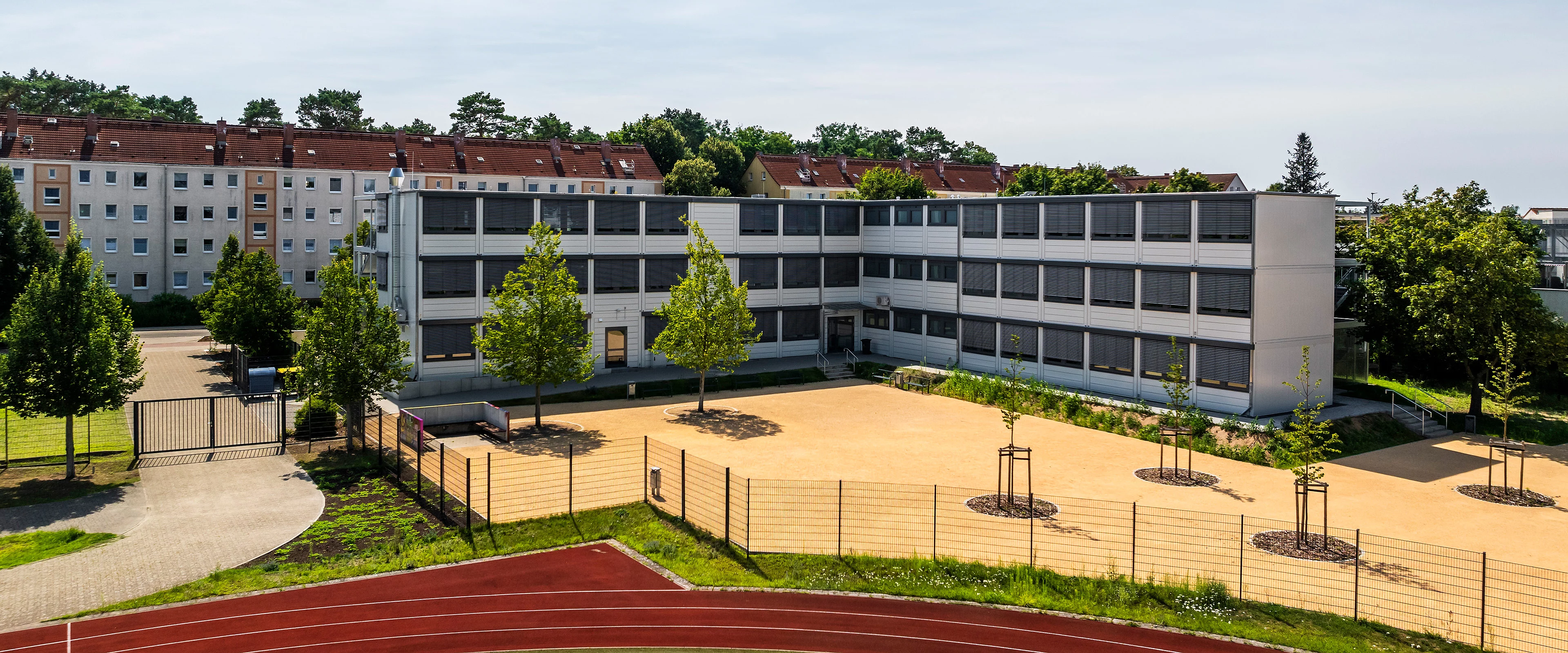 Bereits im Sommer 2022 errichtete das Projektteam aus Bernau um Herrn Rafka und Frau Haeberle zusammen mit der Bauleitung Herr Frank in einem ersten Bauabschnitt einen Schulneubau bestehend aus 57 Containern des Typs ProEnergy. Die Oberschule Finow in Eberswalde (Landkreis Barnim) verfügt seitdem über moderne und großzügige Räumlichkeiten, die optimale Bedingungen zum Lernen, Lehren und Entwickeln bieten. In diesem Jahr kamen weitere 24 Container hinzu, um den Lernraum zu erweitern.