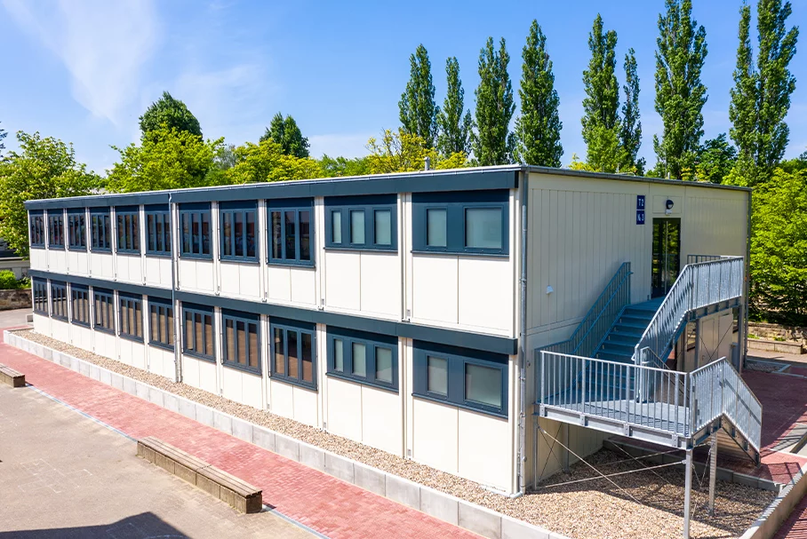 Nur 55 Schulplätze für rund 100 Erstklässler – so sah die Situation im Einzugsbereich der Lankwitzer Grundschule am Königsgraben in Berlin Steglitz-Zehlendorf noch vor kurzem aus. Die Stadt musste handeln: Bis in etwa vier Jahren das Schulgebäude aus den 1950er Jahren erweitert sein soll, bietet ein Interimsgebäude aus hochwertigen FAGSI Schulcontainern ausreichend Platz zum zeitgemäßen Lernen. In nur 12 Wochen Bauzeit wurde die zweigeschossige Schule für 240 Mädchen und Jungen im Hof der Bestandsschule errichtet. 56 Container der Baureihe FAGSI ProENERGY setzen sich auf zwei Etagen zu insgesamt 884 Quadratmeter Fläche zusammen. Acht Klassen- und Horträume, die dazugehörenden Nebenräume und Sanitärbereiche sowie ein Lehrerzimmer finden hier Platz – entlang eines Mittelflurs effizient angeordnet. Alle Klassen- und Horträume sind stützenfrei konstruiert und jeweils rund 55 Quadratmeter groß. Das Erdgeschoss wurde zur Umsetzung des Inklusionsgedankens an Berliner Schulen barrierefrei konzipiert und verfügt über ein rollstuhlgerechtes WC. An den Stirnseiten mündet der Flur in zwei Treppenhäuser – ein innen liegendes Haupttreppenhaus und ein außenliegendes Fluchttreppenhaus. Hochwertige Schallschutztüren sorgen dafür, dass Geräusche auf den Fluren die Konzentration in den Klassenzimmern nicht beeinträchtigen. Wände und Fußböden sind in freundlichen Farben nach einem eigenen Farbkonzept gestaltet. Um direkte Sonneneinstrahlung und übermäßige Hitzeentwicklung zu vermeiden, wurde eine Raffstoreanlage installiert, die sich automatisch reguliert. Beheizt wird die Interimsschule über eine Gas-Brennwerttherme. „Um alle Arbeitsplätze notebooktauglich auszustatten, musste auch im temporären Schulgebäude eine umfangreiche EDV-Leitungsführung realisiert werden. Das Konzept dafür hat FAGSI selbst erstellt, spezielle Kabelkanäle entwickelt und unter Putz verlegt. Für die Versorgung der Schule mit modernster Datentechnik mussten die Räume – und demnach auch die Container – eine ausreichende Höhe haben, damit ein Teil der Installationen über den abgehängten Akustikdecken untergebracht werden konnte. Außerdem mussten wir eine effiziente Brandmeldeanlage sowie eine aufwendige Amokanlage im die neuen Containeranlage integrieren und die Technik an das Bestandsgebäude andocken, damit die Sicherheit der Kinder und Lehrkräfte stets und überall gewährleistet ist“, berichtet Erik Rafka, im FAGSI Vertriebsbüro Berlin für das Schulbauprojekt verantwortlich. „FAGSI hat in jeder Hinsicht alle unsere Anforderungen erfüllen können – baulich wie technisch“, ergänzt Sabine Mahlich, die als Projektleiterin beim Bezirksamt Berlin Steglitz-Zehlendorf die Baumaßnahmen verantwortete. Nach Ablauf der Standzeit werden die 56 Kauf-Container für die Aufstockung der nahe gelegenen Steglitzer Mercator-Grundschule aufbereitet.