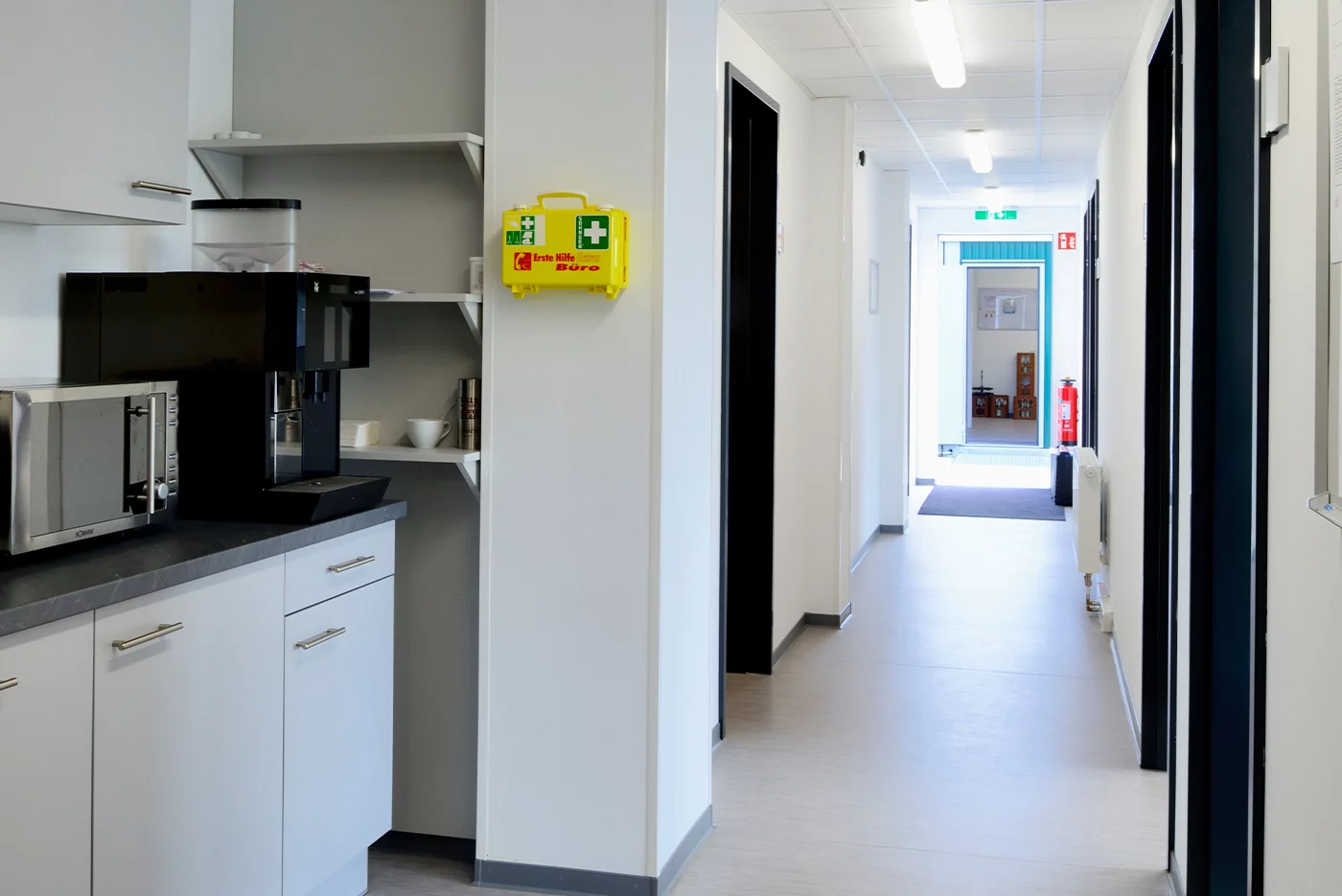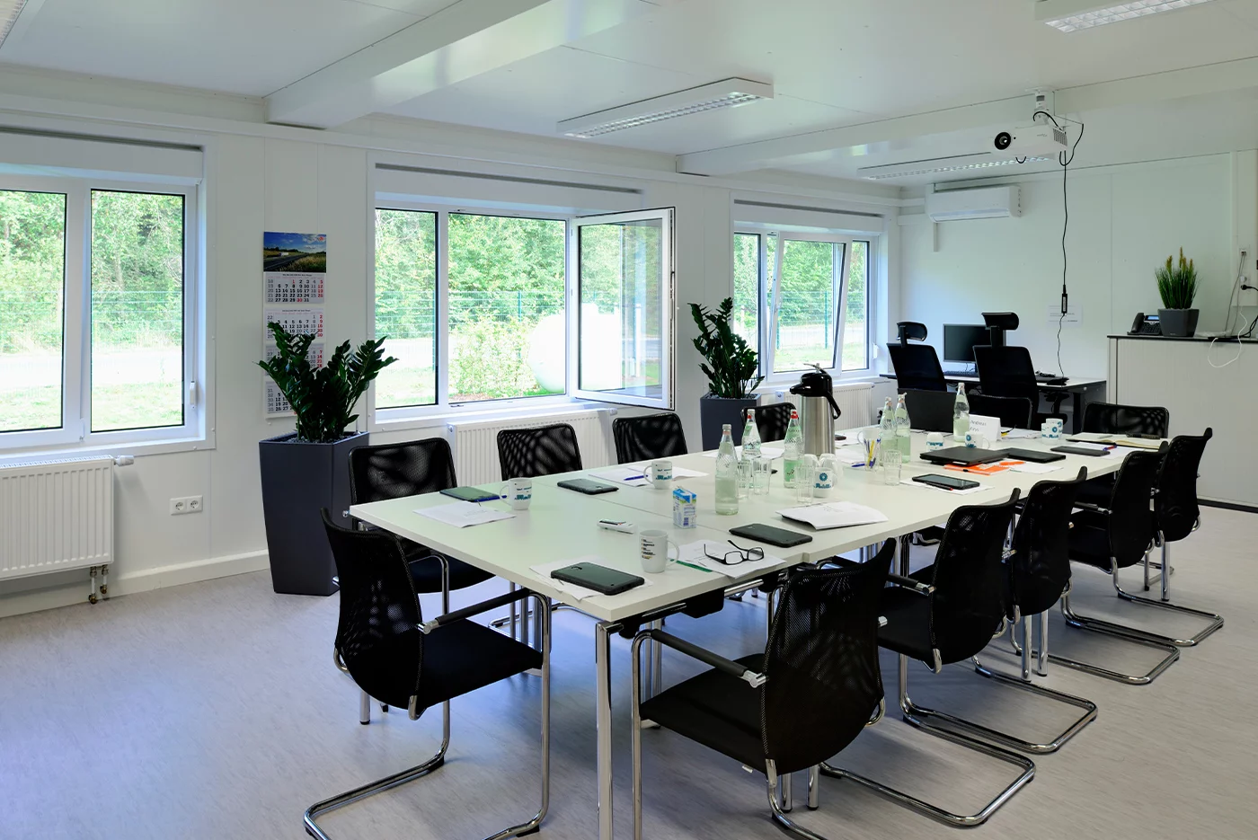 Das Essener Architekturbüro GMR Architekten unter der Leitung von Michael Giebels erarbeitete die Entwurfsplanung des 256 qm umfassenden eingeschossigen Bauwerks aus 14 FAGSI ProENERGY Containern. Das Raumprogramm beinhaltet fünf komfortable Büroräume, Teeküche, einen rund 50 Quadratmeter großen Besprechungsraum, Aufenthalts- und Umkleideräume mit Stiefeltrocknern, Sanitäranlagen für Männer und Frauen sowie einen Technik- und EDV-Raum. Als separates Gebäude wurde gleich nebenan ein eingeschossiges Lagergebäude erstellt. Es besteht aus 10 FAGSI ProBASIC Containern und bietet auf insgesamt 188 qm viel Platz für Materialien, Werkzeuge und Baugeräte.