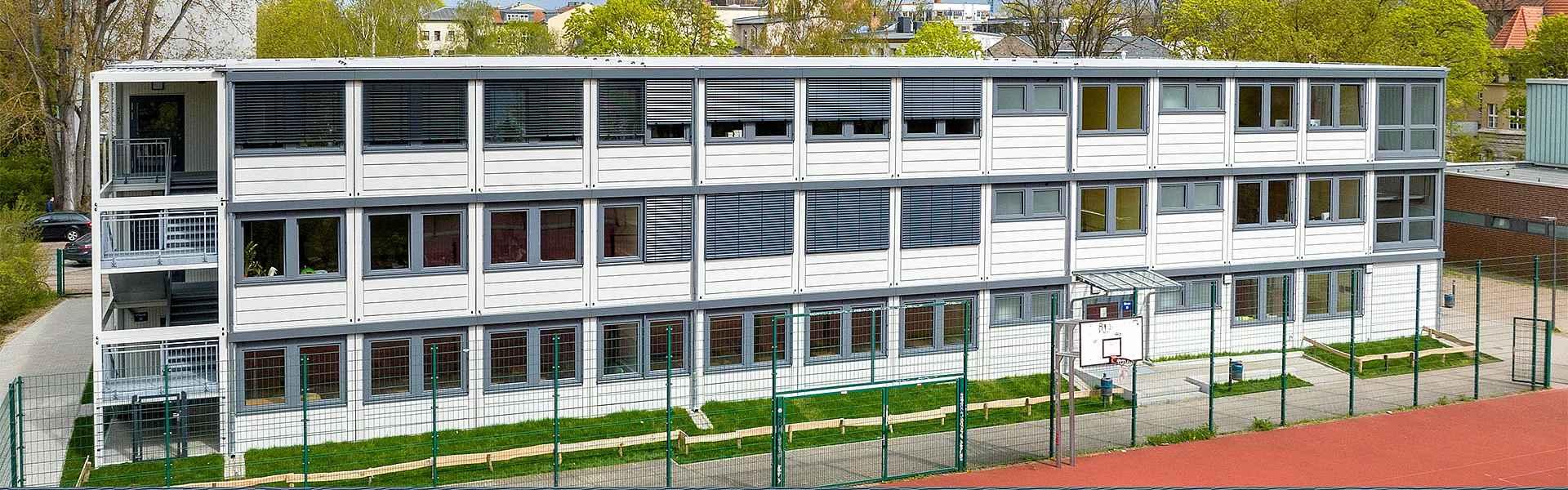 Das bisher größte Projekt ist der Schulergänzungsbau für die Wilhelm-Bölsche-Schule. Das dreigeschossige Interimsgebäude wurde aus 51 Container des Typs ProENERGY montiert. Auf 1.857 Quadratmetern finden sich Klassen- und Büroräume, Technik- und Heizungsräume sowie Sanitäranlagen. Die Klassenräume sind mit moderner Technik ausgestattet, auf der Fassade sind außerdem anthrazitgraue Raffstores zum Sonnenschutz angebracht.