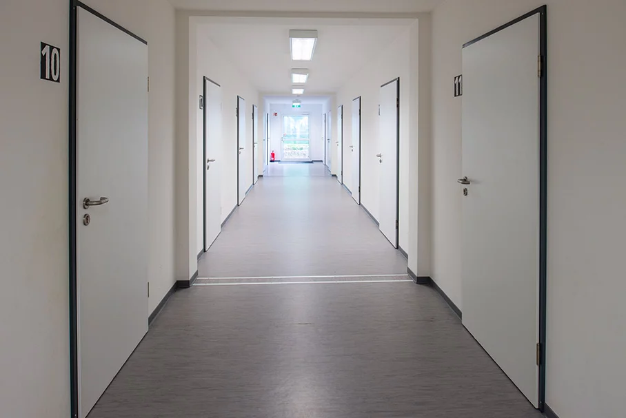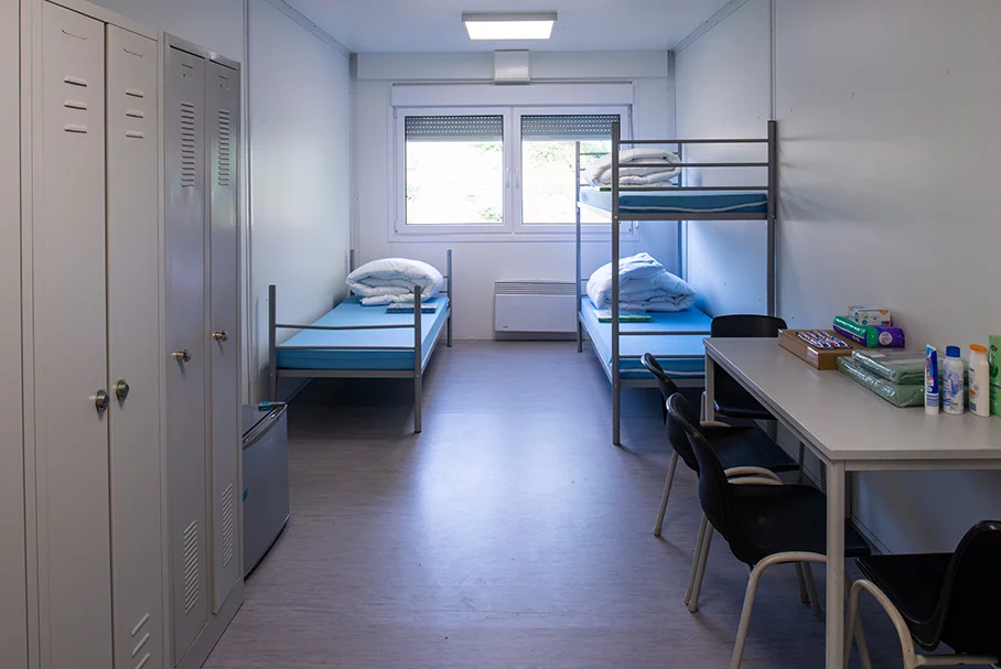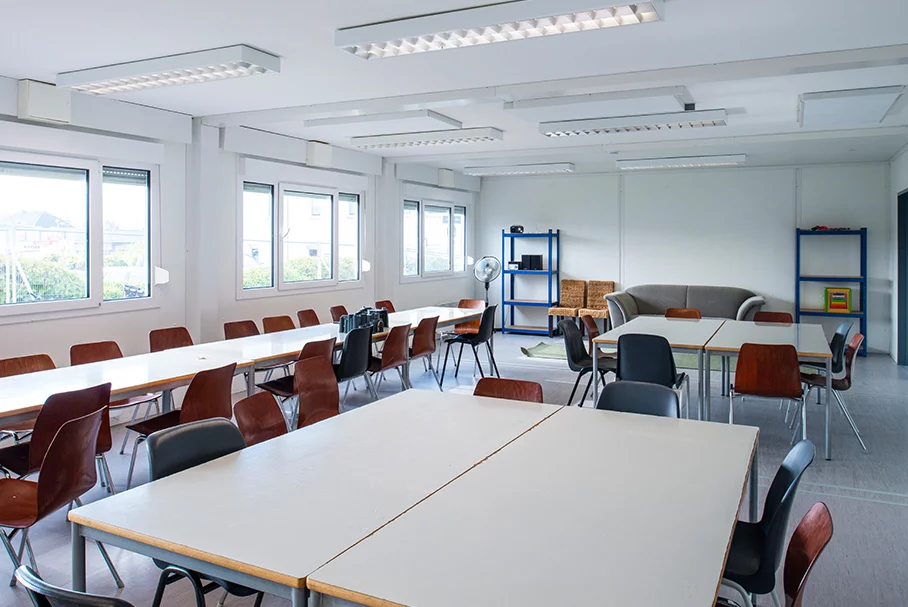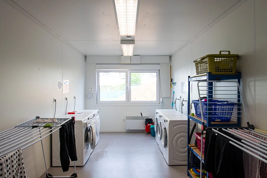 Die hohe Zahl an Asyl- und Schutzsuchenden, die vor Krieg, Verfolgung und Not aus ihrer Heimat geflüchtet sind, stellt Europa vor große Herausforderungen. Über 100 Mio. Menschen – so schätzt das UN-Flüchtlingshilfswerk UNHCR – sind derzeit weltweit auf der Flucht. Deutschland schultert dabei im Vergleich zu anderen EU-Mitgliedstaaten einen überproportionalen Anteil, wie das Bundesministerium für Wirtschaft und Klimaschutz berichtet. Der anhaltende Zustrom von Geflüchteten ist ein enormer Kraftakt, den viele Städte und Gemeinden nun schon seit einigen Jahren stemmen müssen und dem sie sich ganz individuell stellen: So hat die Verbandsgemeinde Bad Hönningen bereits seit der letzten „Flüchtlings-Welle“ im Jahr 2015 eine offizielle Organisatorin berufen, die sich um die Flüchtlingskoordination in der Verbandsgemeinde kümmert und sich außerdem für die Belange der vielen Helferinnen und Helfer in der Flüchtlingsarbeit einsetzt. Auf dem Firmengelände einer Supermarktkette an der Sprudelstraße in Bad Hönningen hat FAGSI Ende Juli 2022 eine 790 qm große Container-Wohnanlage für rund 70 Menschen errichtet. „Schnell ein geeignetes Grundstück zu finden, das in zentraler Lage eine fußläufige Erreichbarkeit von Einzelhandel und ÖPNV bot, war bereits eine große Herausforderung“, erinnert sich Bettina Sauer. „FAGSI war im Rahmen des Vergabeverfahrens für das Bauvorhaben nicht nur der wirtschaftlichste Anbieter sondern konnte vor allem auch den von uns vorgegebenen Zeitrahmen für die Realisierung garantieren. Und das war in dieser Situation eine der wichtigsten Maximen.“ Das Gebäude ist vorerst für eine Standzeit von zwei Jahren konzipiert. Die 55 Meter lange, eingeschossige Anlage setzt sich aus 45 Containern zusammen und konnte in nur 3 ½ Wochen aufgebaut werden. So stillt sie schnell und unkompliziert den dringenden Bedarf an Wohnraum für Einzelpersonen ebenso wie für geflüchtete Familien. Die insgesamt 21 Zimmer, jeweils 16,5 qm groß, können bei Bedarf über Türen miteinander zu größeren Einheiten verbunden werden und damit auch kleineren Gruppen und Familien ein gemeinsames Wohnen ermöglichen. Sanitäre Anlagen mit Duschen und WCs befinden sich als getrennt gemeinschaftlich genutzte Bereiche in der Gebäudemitte. In zwei voll ausgestatteten Küchen kann selbst gekocht werden, zum Essen und Verweilen steht den Bewohnern ein fast 70 qm großer stützenfreier Aufenthaltsraum zur Verfügung. Ausreichend Waschmaschinen und Trockner sind in einem Wäscheraum ebenfalls vorhanden. Ergänzt wird das Raumprogramm durch Büroräume für Hausmeister und Security sowie Technik-, Lager- und Abstellräume. Das Bauwerk ist funktional gestaltet, um die Möblierung kümmerte sich FAGSI ebenfalls. Geheizt wird mittels Elektro-Konvektionswandöfen, die Leitungen für Zu- und Abwasser waren auf dem Grundstück bereits vorhanden und konnten problemlos angefahren werden.
